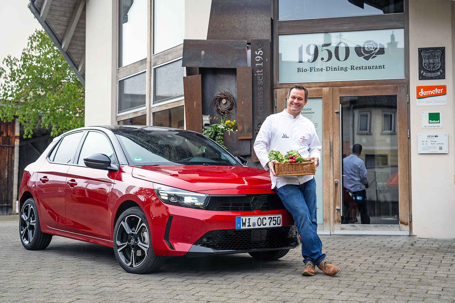 Das Restaurant ist eine Mischung aus modernem Design und traditionellem Charme – eine Oase, die die Gäste in eine Welt entführt, in der gutes Essen nicht nur eine Mahlzeit ist, sondern ein Erlebnis. „Es geht darum, das Beste aus der Region herauszuholen und mit modernen Elementen zu kombinieren“, betont Simon Tress und öffnet die Fahrertür des Opel Corsa. Unter der roten Haube steckt eine Menge Technik. Der 48-Volt-Hybrid-Antrieb hilft dem klassischen Dreizylinder beim Starten, Anfahren, Beschleunigen und letztlich Sprit sparen. Weil der Akku automatisch aufgeladen wird, entfällt der Stopp an einer Ladesäule. „Opel ist eine nahbare Marke, die solch moderne Technik auch in Kleinwagen einsetzt – genau das schätze ich“, sagt er.