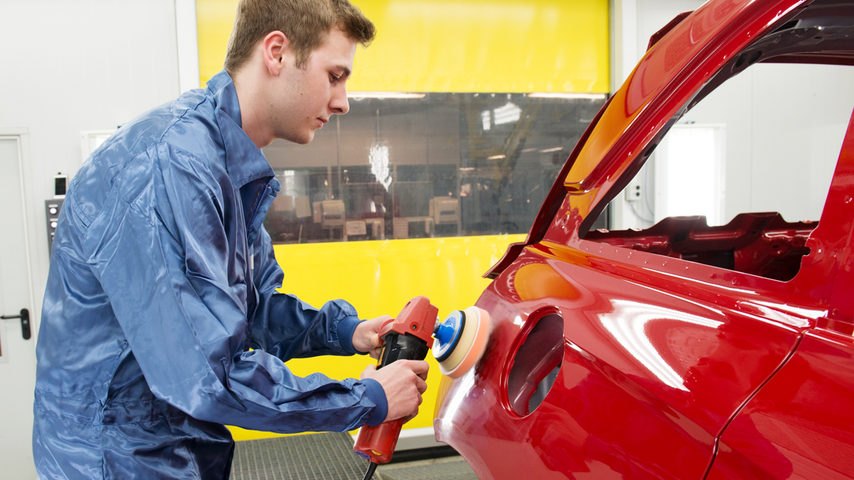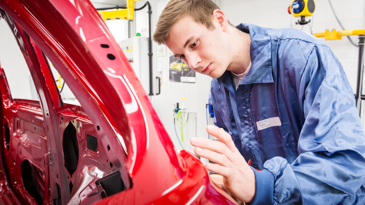 Am 1. September 2011 startete der Auto-Fan, der aktuell einen gelb-schwarzen Opel Corsa D fährt, seine Lehre in der Wartburgstadt. Im Sommer 2014 stand die finale und entscheidende Prüfung zum Facharbeiter an. Der umfangreiche Praxisteil hatte es in sich: Zunächst musste Christian Walter eine schwarze Corsa-Tür mit drei Dellen wieder herrichten – also spachteln und lackieren und anschließend auf die Tür eine Grafik aufbringen. Ein Logo mit Schriften und Designelementen musste auf eine schwarze Kunststoffplatte gesetzt werden und eine beschädigte vordere Kunststoffstoßstange instand gesetzt werden. Zu guter Letzt musste Walter noch einen Arbeitsablaufplan schreiben.