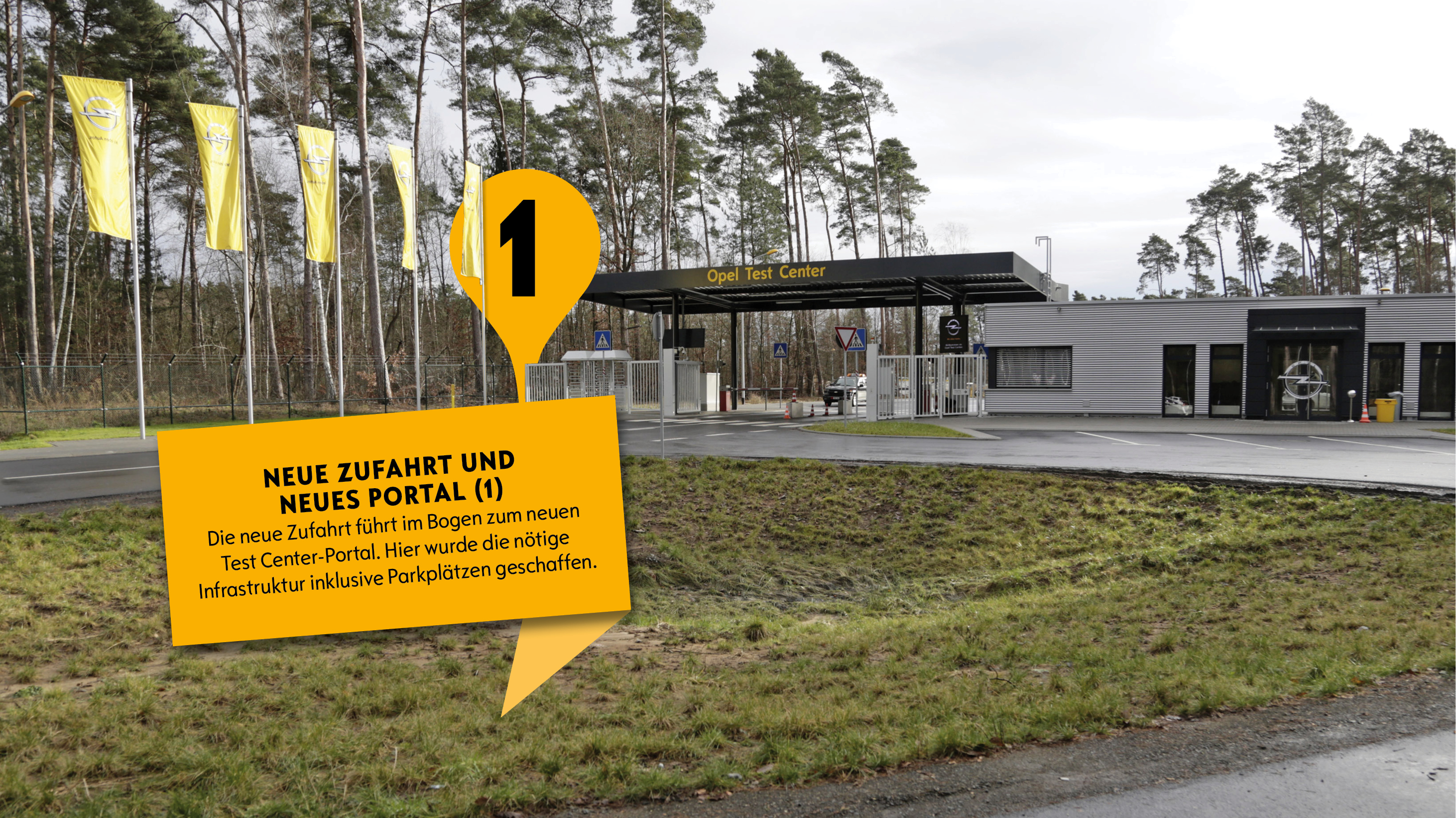 Die neue Zufahrt entstand nordöstlich der bisherigen. Sie führt im Bogen zum neuen Portal des Test Centers und den neuen Parkplätzen.