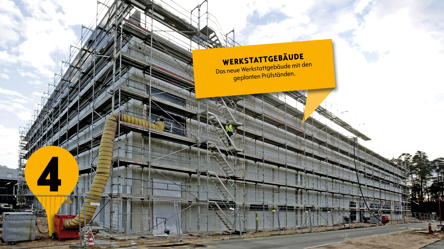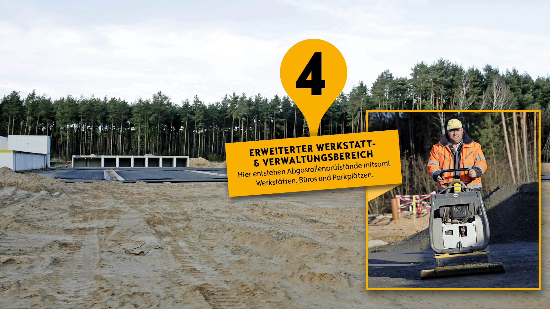 Hier entstehen für die Entwickler Abgasrollenprüfstände mitsamt Werkstätten, Büros und 100 Parkplätzen. Im südöstlichen Teil wird die Chassis-Werkstatt mit einem Hochregal-Reifenlager und 60 neuen Parkplätzen gebaut.