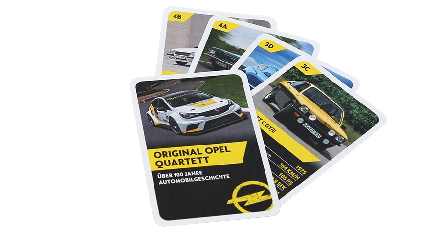 Das Zocken mit dem „Original Opel Quartett“, neu im Angebot des Opel-Shops, entfacht noch immer denselben Kitzel wie früher. „Über 100 Jahre Automobilgeschichte“ sind in den 32 Karten vereint, zusammengestellt und geprüft von Jens Cooper, Opel-Experte und Mitarbeiter der Opel Classic Werkstatt. Ein Jahrhundert Opel für die Hosentasche. Für die Mittagspause. Für den Feierabend. Für ein Spielchen mit dem Nachwuchs. Nehme ich bei der „Schwarzer Witwe“ die Motorleistung oder besser das Leergewicht? Nervenkitzel inklusive Zeitreise gibt es im Opel-Shop für 3,90 Euro.