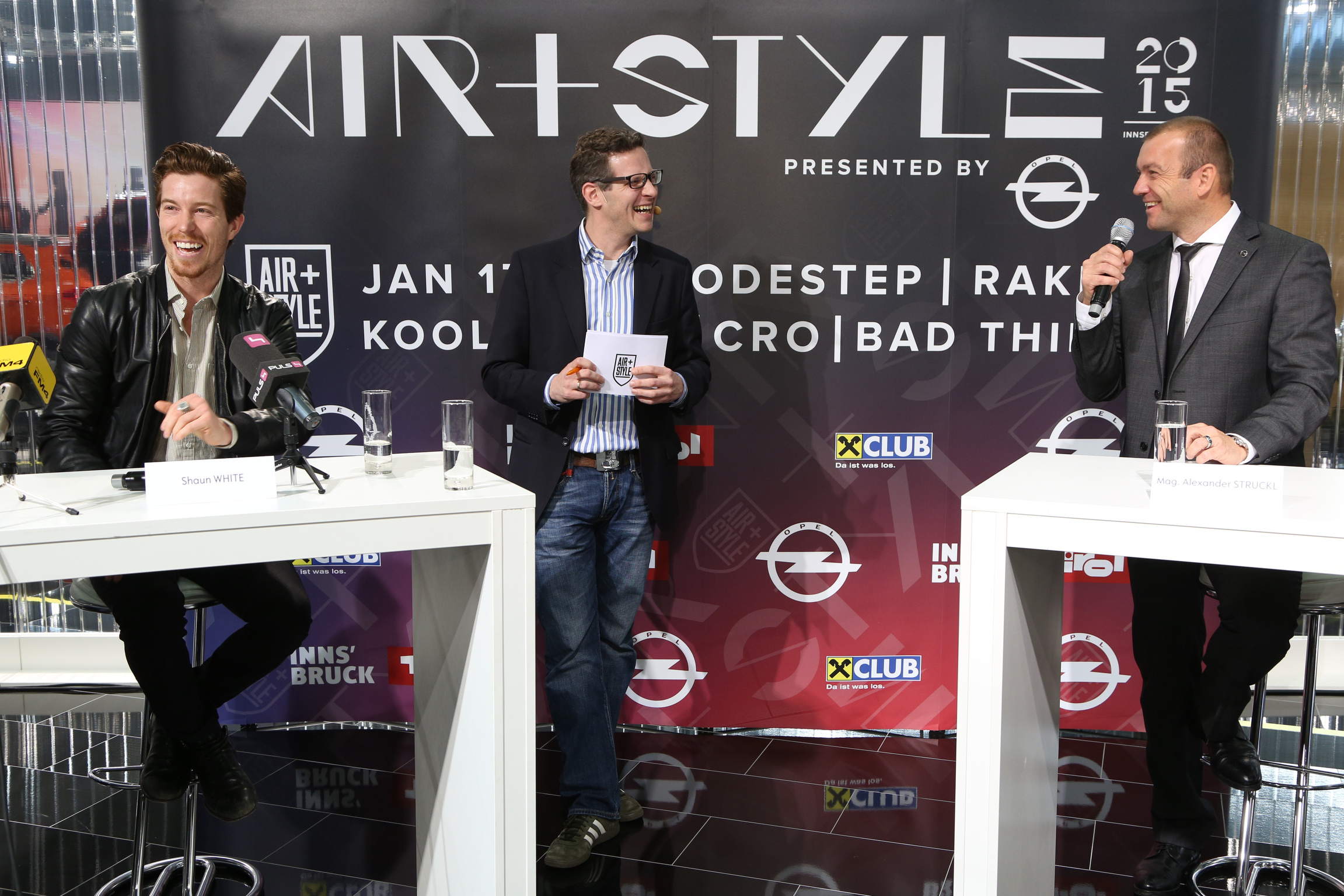 Pressekonferenz (v.l.n.r.: Shaun White/zweifacher Snowboard-Olympiasieger, Moderator Martin G. Natschläger,