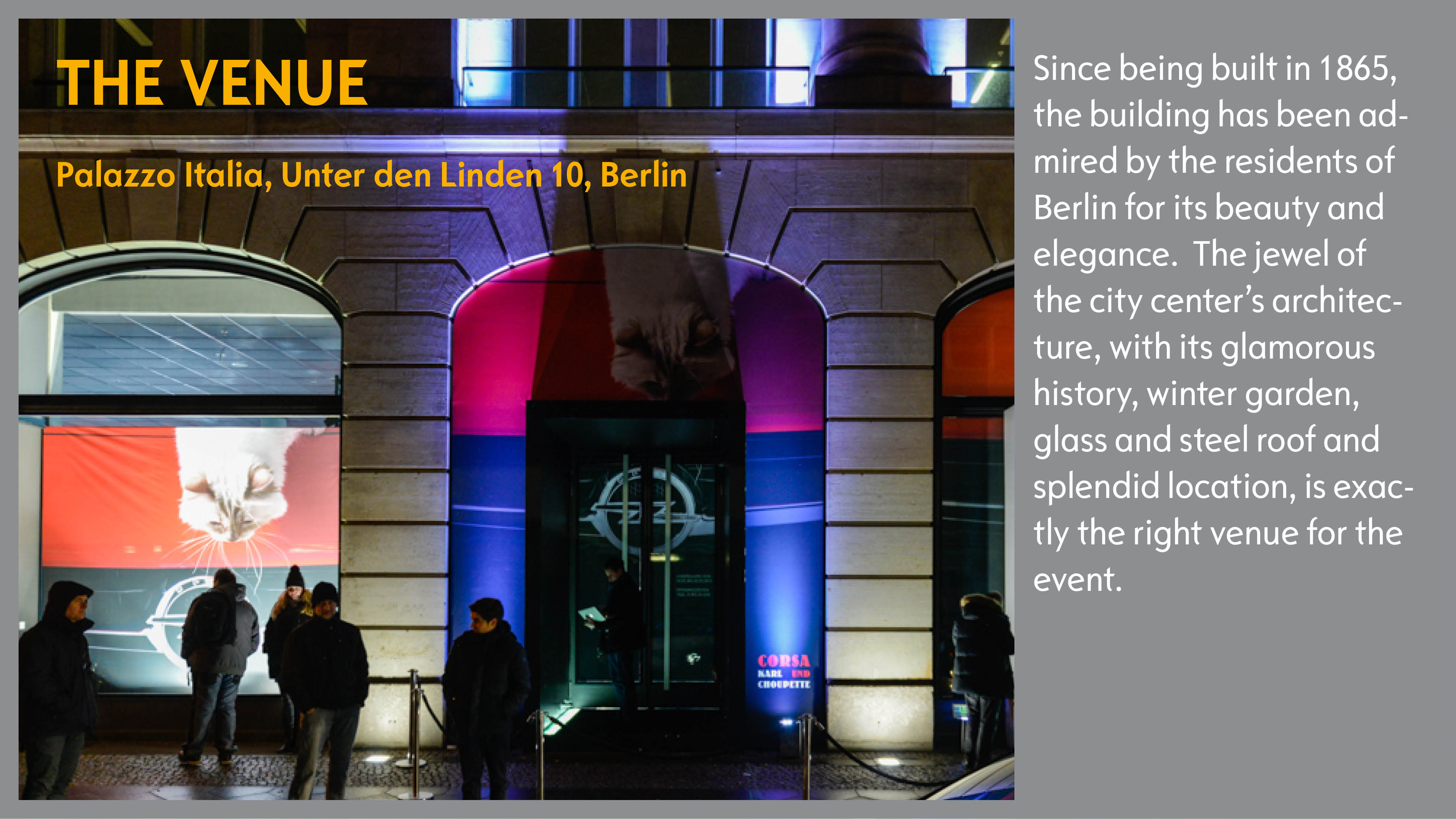 Anyone who would like to see the exhibition “Corsa Karl and Choupette“ can do so until February 22, 2015 in Palazzo Italia, Unter den Linden 10, in Berlin-Mitte. Entrance is free, and the exhibition is open daily from 11 am to 8 pm.