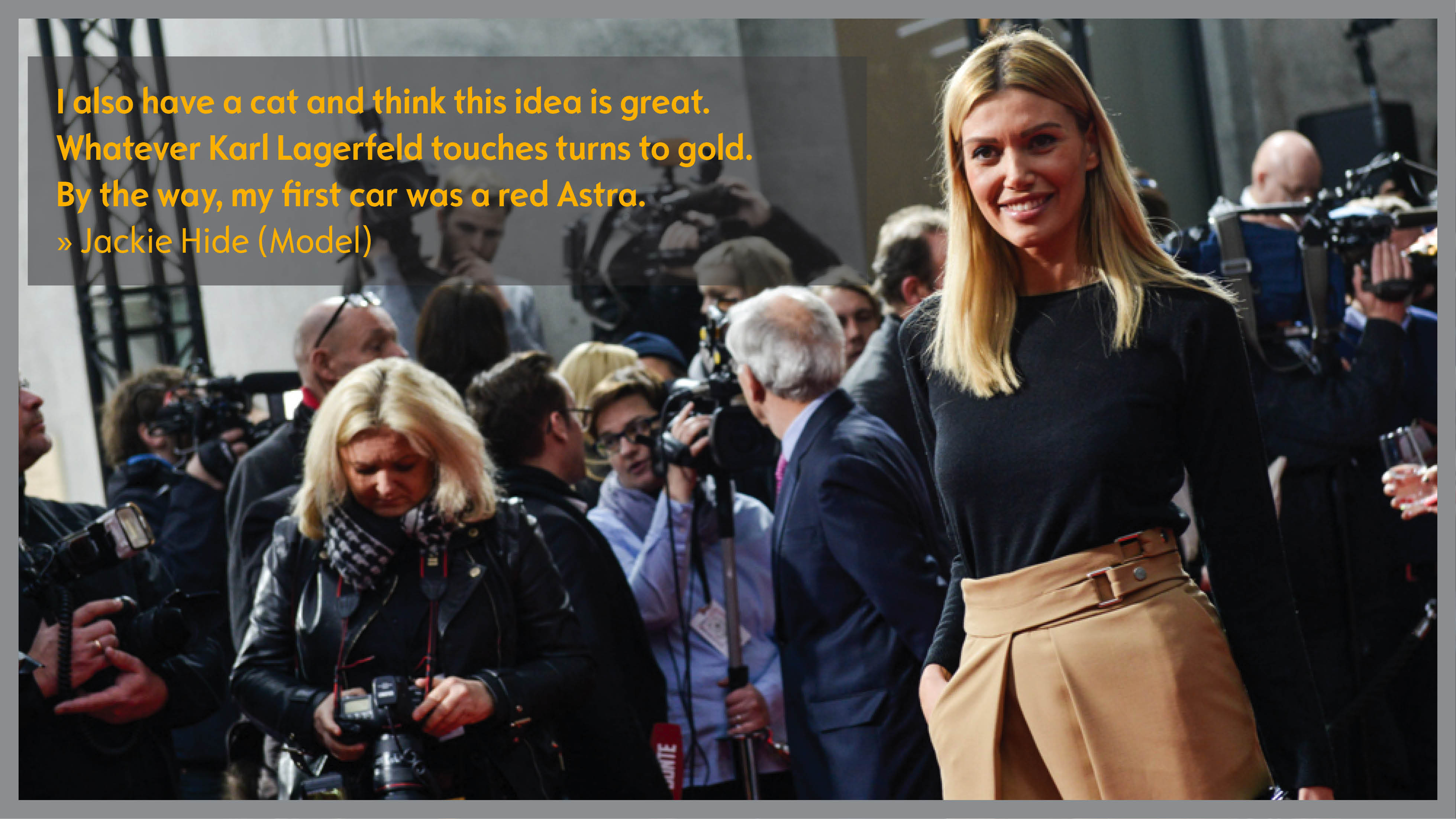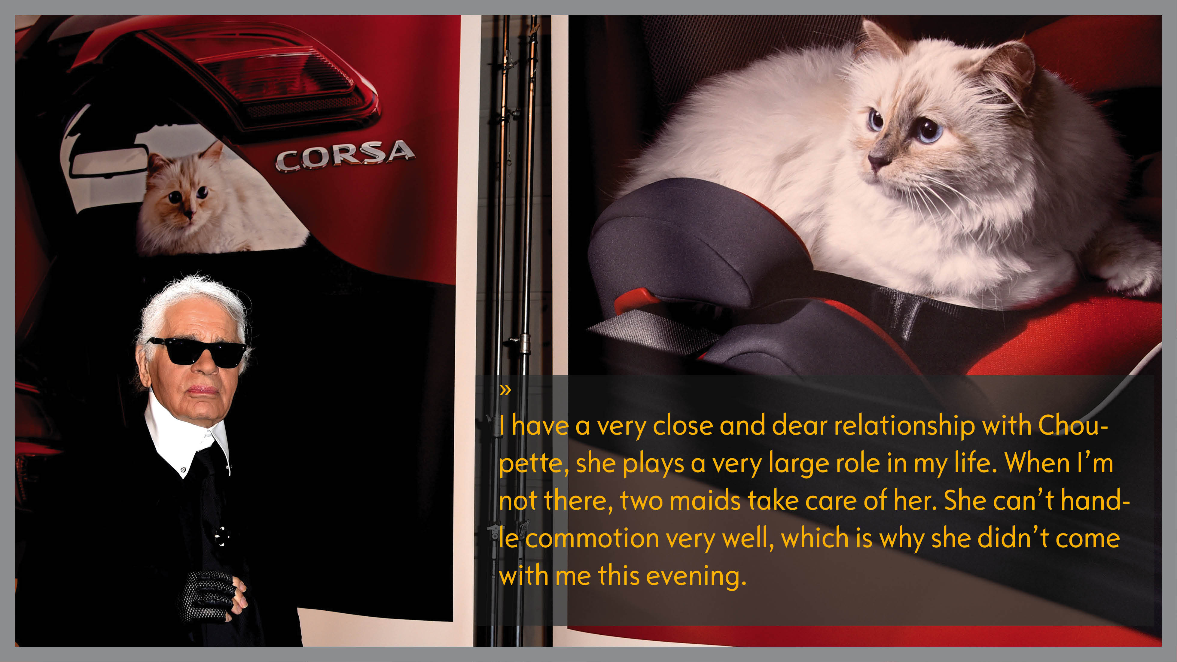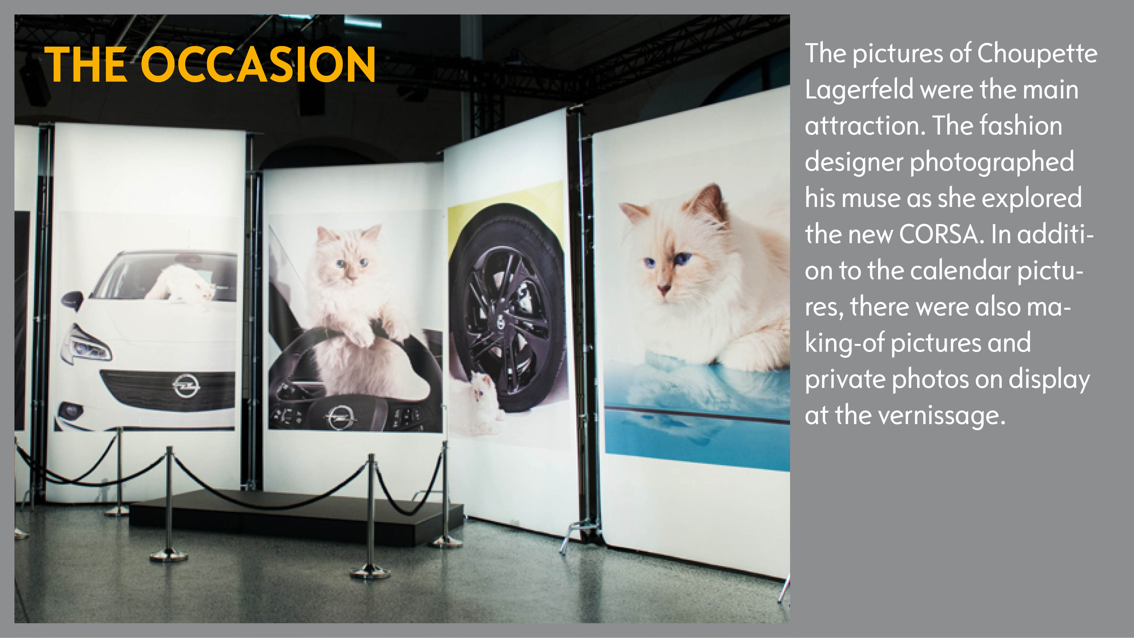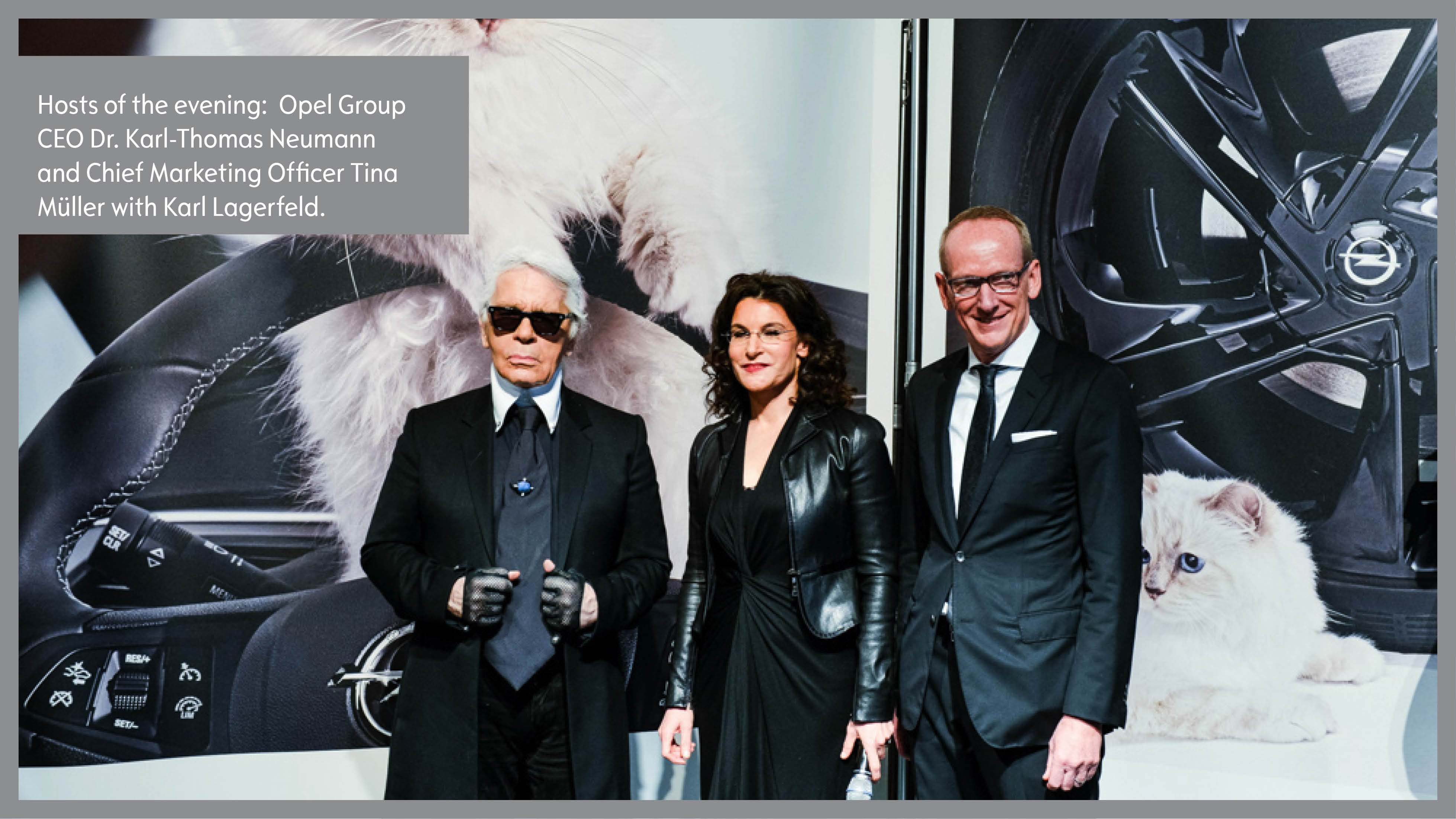 Karl Lagerfeld opened the exhibition on this evening with Opel Group CEO Dr. Karl-Thomas Neumann and Chief Marketing Officer Tina Müller. As to how the unusual collaboration came about, Karl Lagerfeld said: “The idea for the calendar came from Tina Müller, whom I’ve known for quite a while, which is why I was convinced by the project. A big compliment to Tina, she did a great job.” Dr. Karl-Thomas Neumann was very pleased with the result: “I was thrilled that we were able to showcase the new Opel Corsa so prominently with the calendar and this exhibition, and that Karl Lagerfeld personally opened this vernissage today with the one-and-only model Choupette in the spotlight.”