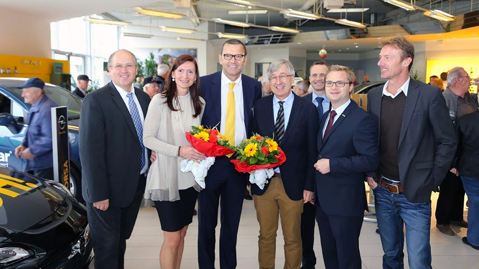 - 1. Oktober 2015: Übernahme des Opel-Autohauses in Mistelbach durch Klaus Mayer (v.l.n.r.: Bürgermeister Dr. Alfred Pohl, Elisabeth und Klaus Mayer, der vorherige Besitzer Hans Brantner sen., Opel Austria-Verkaufsleiter Markus Oppel, Stadtrat Erich Stubenvoll, Erich Fasching/Stadtmarketing Mistelbach).