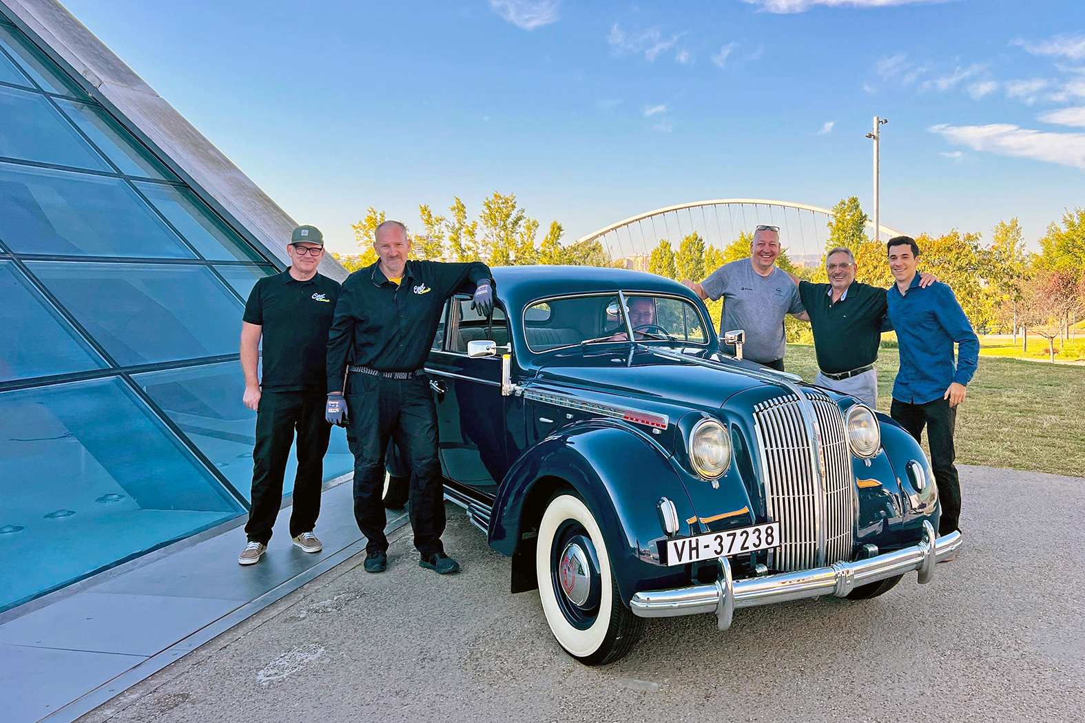 Zur Eröffnung vor Ort: Opel Classic-Chef Leif Rohwedder (zweiter von links) und Initiator Antonio Cobo (zweiter von rechts) – zusammen mit dem Opel Admiral von 1937.