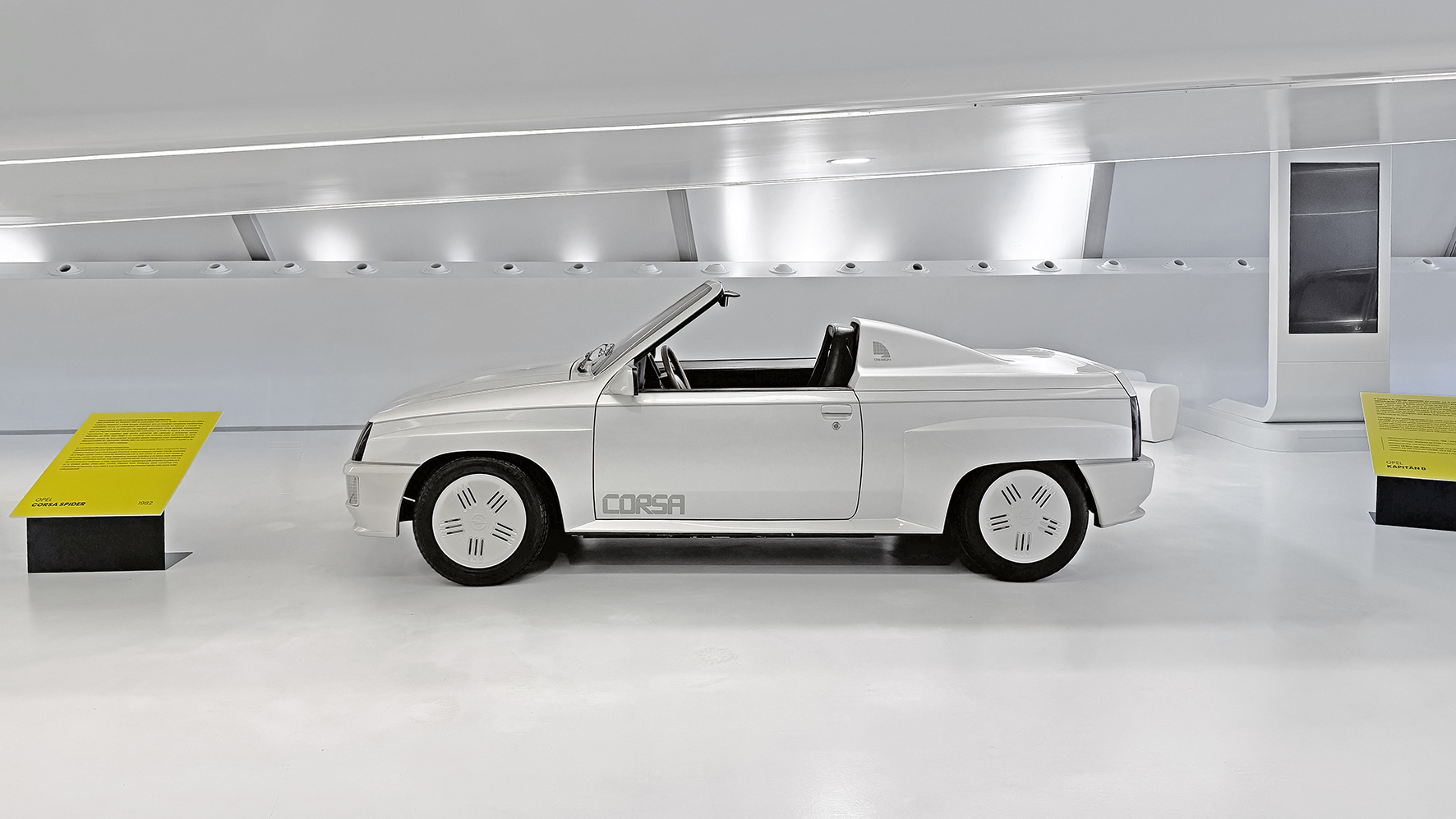 Und natürlich darf in Zaragoza der Corsa selbst nicht fehlen. Seit 1982 läuft er hier vom Band, inzwischen in sechs Generationen – und mit mehr als 14 Millionen verkauften Exemplaren ist er untrennbar mit Aragón verbunden. Vom klar gezeichneten Corsa A über Varianten wie den Corsa Spider bis zur Studie Corsa B „Moon“ zeigt die Ausstellung, wie wandelbar dieses Erfolgsmodell ist.