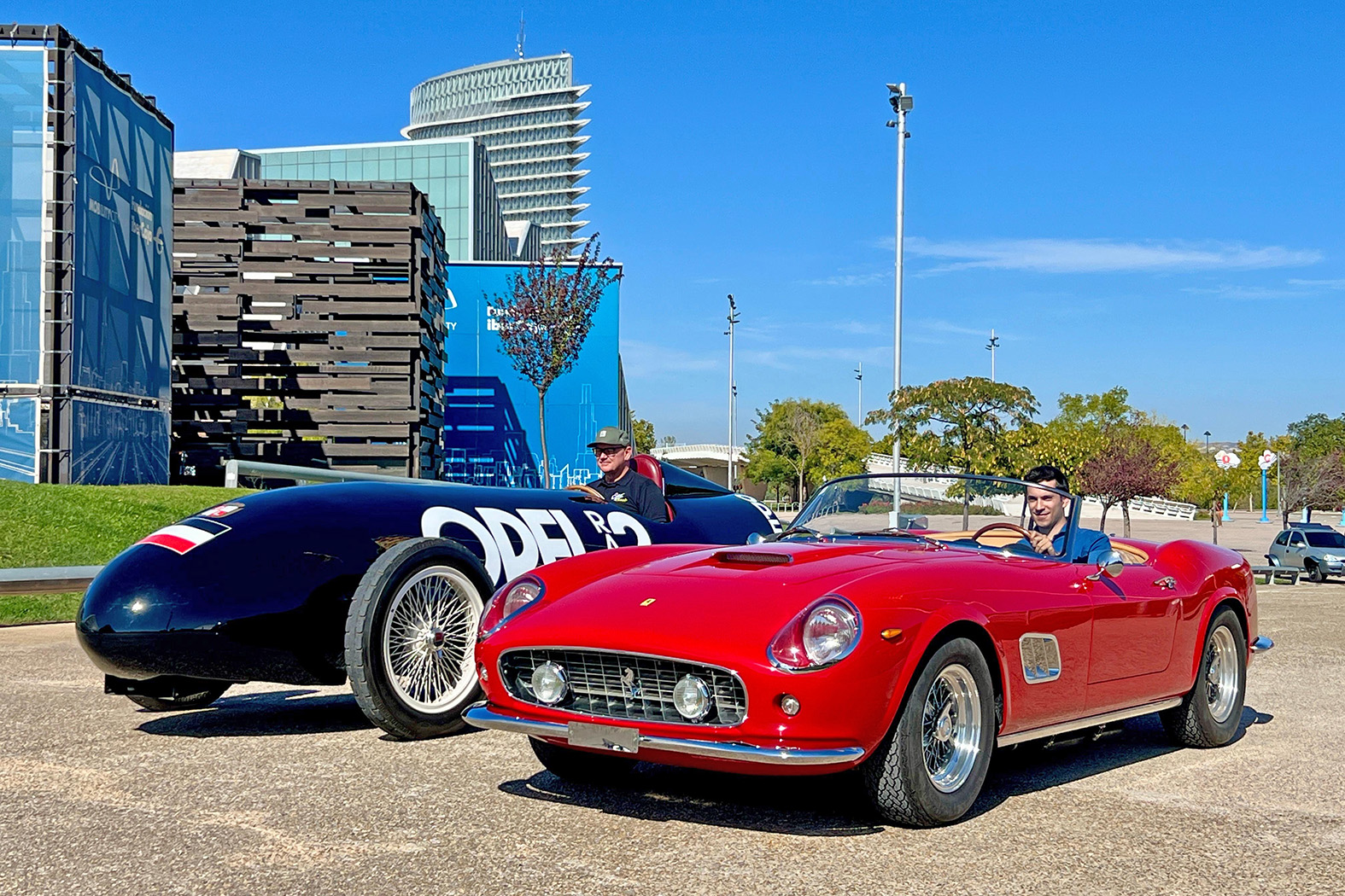 Raketenpionier trifft Sportwagen-Ikone: Der RAK 2 steht für kompromisslose Höchstgeschwindigkeit, der Ferrari 250 GT California Spyder für elegante Sportlichkeit.