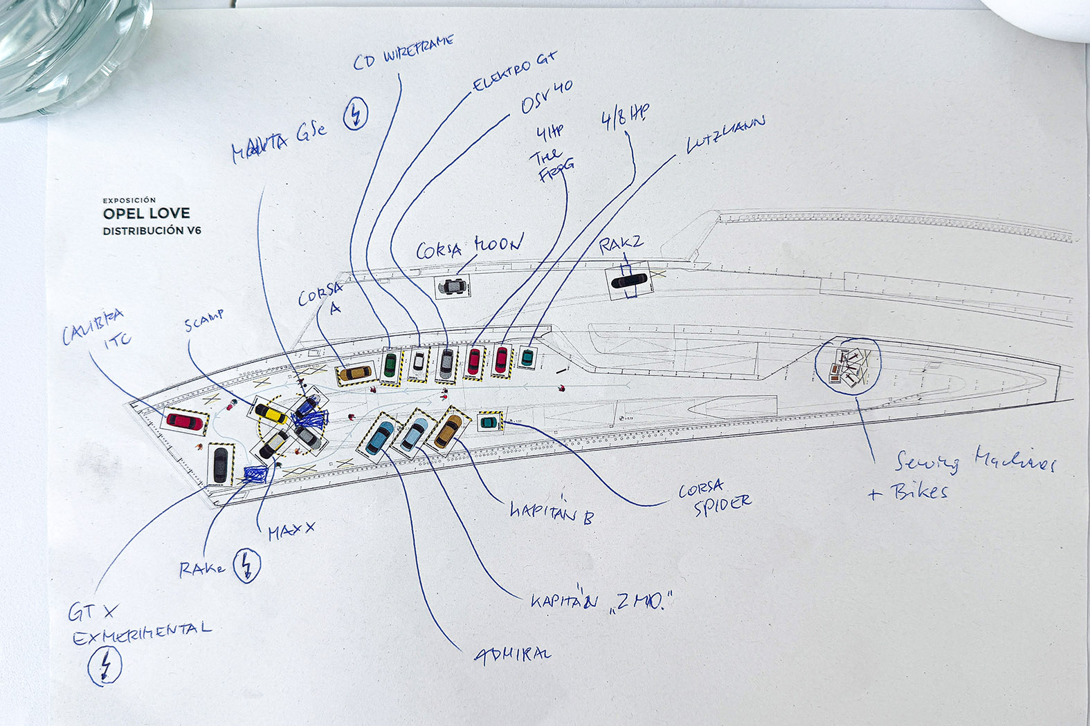 Handskizze der Ausstellung: 25 Opel-Exponate präzise verortet – eine Reise durch Vergangenheit und Zukunft.