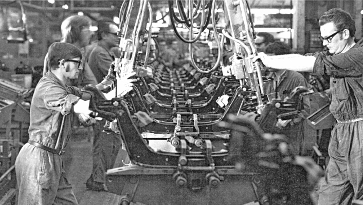 - Produktion des Kadett A: Bochumer Opelaner bei der Achsenmontage. Das Bild stammt von 1963.