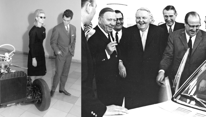 - Sportliche Prominenz, 1964 Eiskunstlauf-Weltmeister Hans-Jürgen Bäumler und Marika Kilius besuchten das Werk im Jahr 1964. Die Geburtsstätte des Bestsellers Kadett wollte auch Bundeskanzler Ludwig Ehrhard (4. von links) näher kennenlernen, ihm zur Seite stand während des Besuchs 1965 Bochums Oberbürgermeister Fritz Heinemann (rechts).