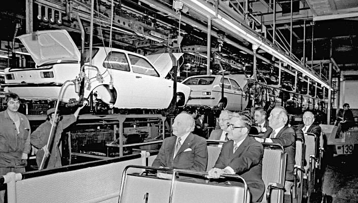 - 16. Februar 1977: Bundespräsident Walter Scheel (sitzend, 1. v. l.) besichtigt das Werk.