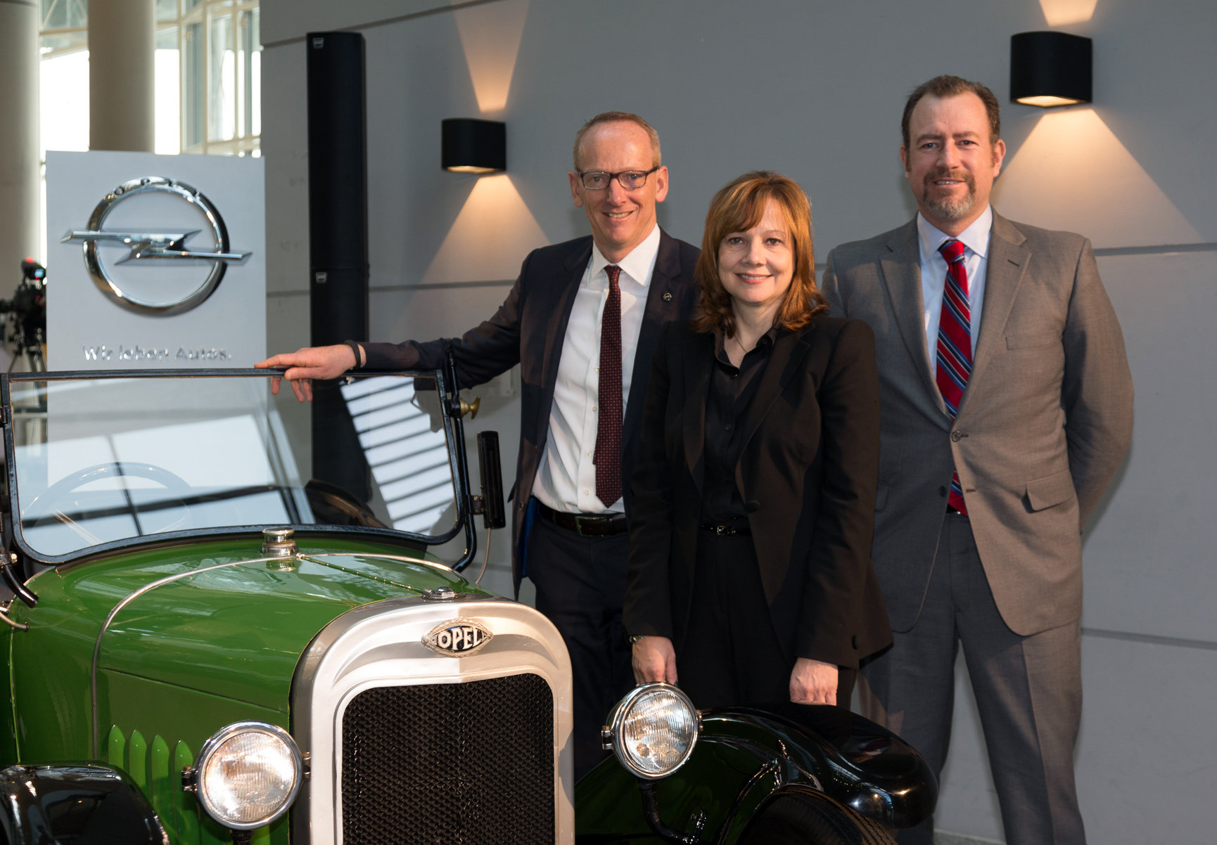 - Opel CEO Karl-Thomas Neumann, GM CEO Mary Barra, GM President Dan Ammann next to an Opel ‘Tree Frog’ dating from 1924.