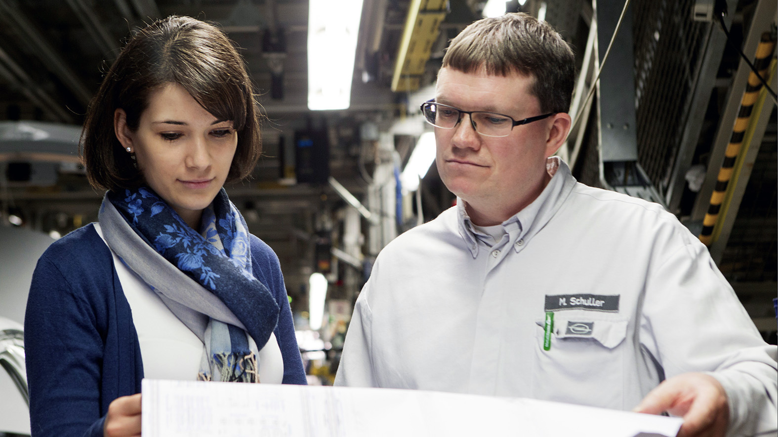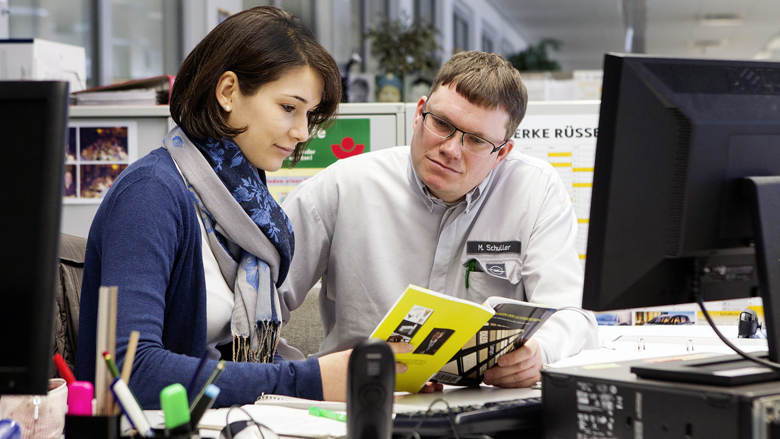 - Sie haben einen Plan: Umwelttechnik-Studentin Janine Kern und ihr Betreuer Mario Schuller, Koordinator für Umwelt- und Energiemanagement bei Opel. Für ihre Bachelor-Arbeit an der Hochschule RheinMain soll Kern ein neues Beleuchtungskonzept für die Fertig- und Endmontage erarbeiten. Schuller unterstützt die Nachwuchskraft.
