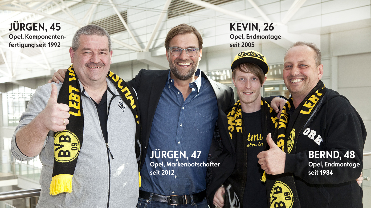 Klopp: Weil da nicht nur sportlich ein Reiz war. Es ist die Tradition, der Spirit, das Stadion, allein das Beben in der Südkurve ist ein atmosphärischer Schmelztiegel – grandios. Deshalb passt der Claim „Echte Liebe“ tatsächlich so gut zu uns als Verein. Echte Liebe zeigt sich darin, dass die Fans uns immer treu geblieben sind – auch in den tiefsten Tiefen. Die kommen nicht erst, wenn wir wie Schmidts Katze abgehen. Ich denke, ihr bei Opel könnt gut nachvollziehen, wovon ich spreche.