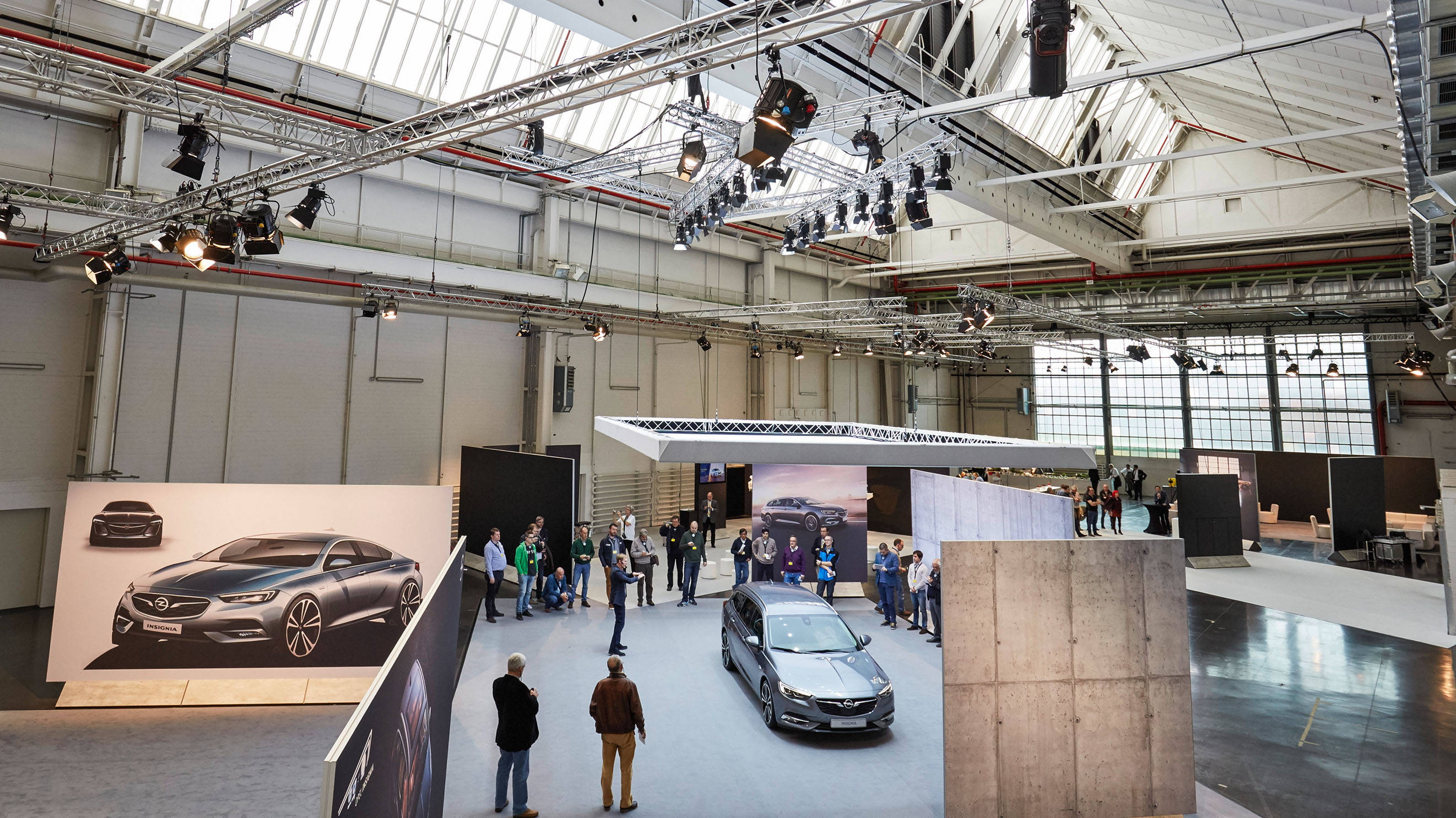 Wer das K48 betritt, fühlt sich wie der Gast einer exklusiven, feinen Automesse. Luftig-loftig das Ambiente. Industrial Chic mit herabhängenden Leuchten. Hier ein fluffiger Teppich. Da eine mobile Wand als Raumtrenner. Gigantische Bilder, Schriftzüge, Fakten zum neuen Insignia. Und natürlich das Fahrzeug selbst, begleitet von seinen legendären Vorfahren, den KAD-Modellen Kapitän, Admiral und Diplomat. Zur Stärkung gibt es einen frischen Burger – mit Opel-Bitz auf dem knusprigen Brötchen. Während man reinbeißt, schaut Opel-Chef Karl-Thomas Neumann vorbei. Begrüßung. Wie geht’s? Und schon beginnt das Fachsimpeln über den neuen Insignia.