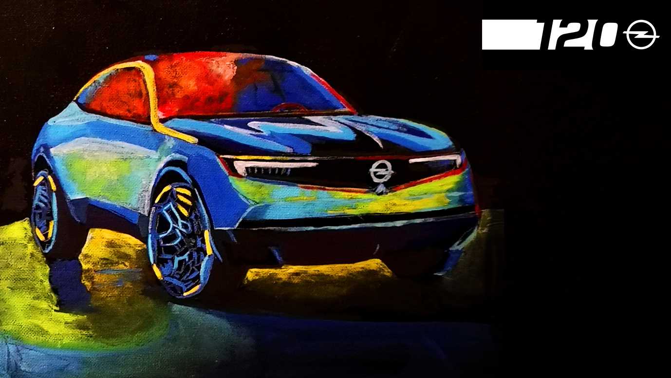 In three to four hours, everyone can immortalize their own experimental vehicle on canvas. “The beautifully structured, pure flowing surfaces of the brand concept vehicle are literally an intrusive template,” says Engels. While the Opel GT X Experimental gives a courageous outlook on the Opel models of the coming years, the second motif leads back to the beginnings of automobile production in Rüsselsheim 120 years ago.