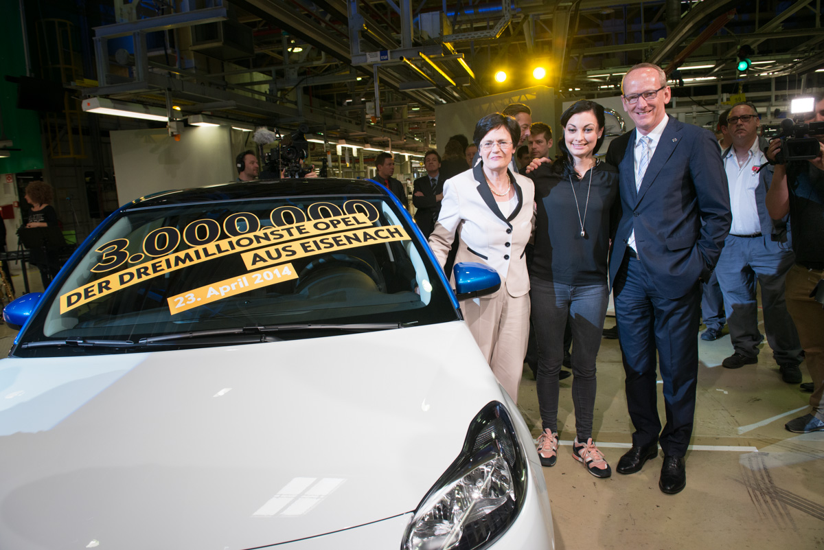 „So, jetzt ist es genau 11.29 Uhr und sie haben noch Zeit, den Schalter umzulegen.“ Sekunden nach den Schlussworten von Thüringens Ministerpräsidentin Christine Lieberknecht öffnete sich das Tor und um Punkt 11.30 Uhr fuhr das dreimillionste im Opel Werk Eisenach gefertigte Auto vom Band. Ein weißer ADAM mit ardenblauem Dach, gesteuert von der Opel Rallye Cup-Fahrerin Lina Van der Mars.