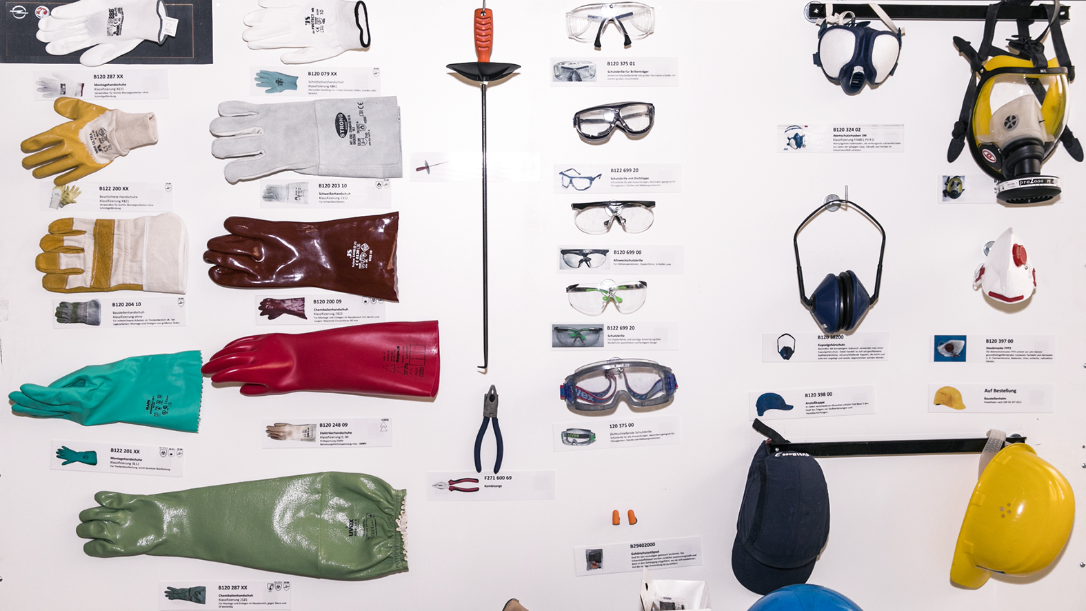 Die Bandbreite der Antworten ist weit gespannt und wird – was die persönliche Schutzausrüstung anbelangt – mit Anschauungsexemplaren untermauert: verschiedene Sorten von Schutzbrillen, Handschuhen, Helmen, Gesichtsschutz, verschiedenen Sorten von Sicherheitsschuhen u.s.f. sind ausgestellt. So sollen die MitarbeiterInnen auf ihren Alltag aus Arbeitssicherheit-Sicht eingestimmt werden.