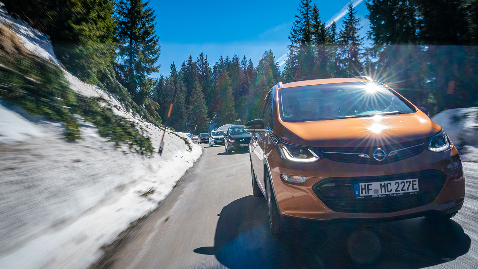 Schon erstaunlich, wie zügig man bei den Vorurteilen und Mythen zum Thema Elektroantrieb landet – oft ohne selbst echte Erfahrungen mit dem Thema gesammelt zu haben. Das ist einer der Gründe, warum sich die 20 Opel Ampera-e-Fahrer Ende März zur gemeinsamen Ausfahrt über die Panoramastraße in der hochalpinen Bergwelt des Berchtesgadener Landes getroffen haben. Sie wollen nicht nur die Aussicht genießen – sondern auch zeigen, wie alltagstauglich aktuelle E-Autos bereits sind. Angereist aus allen Himmelsrichtungen, starteten sie ihre Tour nach einem guten Frühstück in Bad Reichenhall – und schmunzeln kurz nach elf Uhr auf dem höchsten Punkt der Rossfeldstraße für ein Gruppenbild in die Kamera. Hinter ihnen lacht die Sonne über ein malerisches Bergpanorama auf ein gelbes Banner, auf dem geschrieben steht: „2. Opel Ampera-e Treffen 2019“. Motto: „Mit Strom in die Zukunft“. Über das erste Treffen im vergangenen Herbst haben wir berichtet.