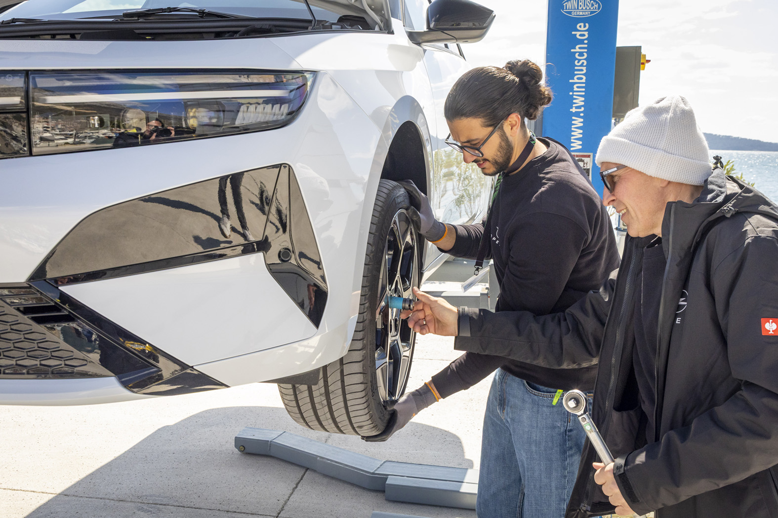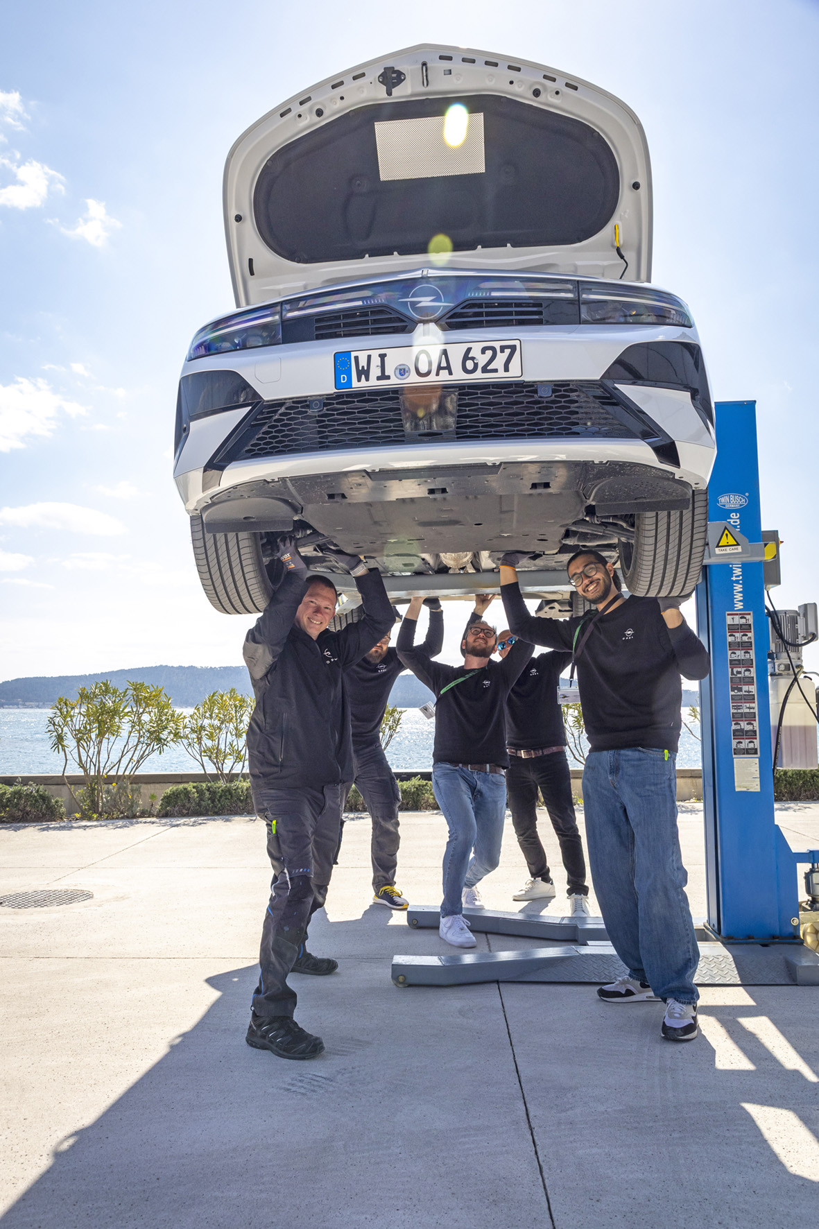Even before the first journalists arrive the Opel service technicians Florian Schmitt, Sigi Kotzott, Tim Gericke, Jan Niklas Hammer and Adem Sevimli (from left to right) are on site and make sure that every detail is right.