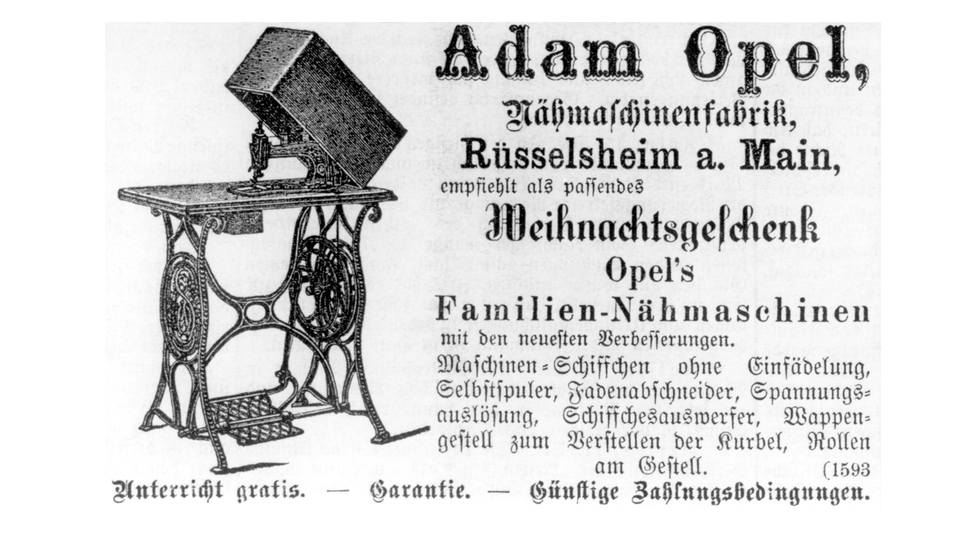Der 25-jährige Adam Opel verließ die zu eng gewordene Werkstatt des Vaters Philipp Wilhelm, bei dem er das Handwerk gelernt hatte, und eröffnete nach dem Kauf von Werkzeugen und Rohstoffen im Herbst 1862 seine eigene Firma. Die Geschäfte der jungen Firma liefen zuerst nur schleppend, die Nachfrage im Frankfurter Umland war gering. Mit dem Krieg zwischen Preußen und Österreich im Jahr 1866 ging jedoch unverhofft der Aufstieg einher: Das Militär benötigte viele, schnell produzierte Uniformen. Am 10. April 1863 erschien im Groß-Gerauer Anzeiger die erste Annonce: „Adam Opel, Mechaniker in Rüsselsheim, empfiehlt selbst gefertigte Nähmaschinen aller Art, nach der neuesten Construction, zu festen und billigen Preißen.“ Die industrielle Revolution war in Rüsselsheim angekommen.