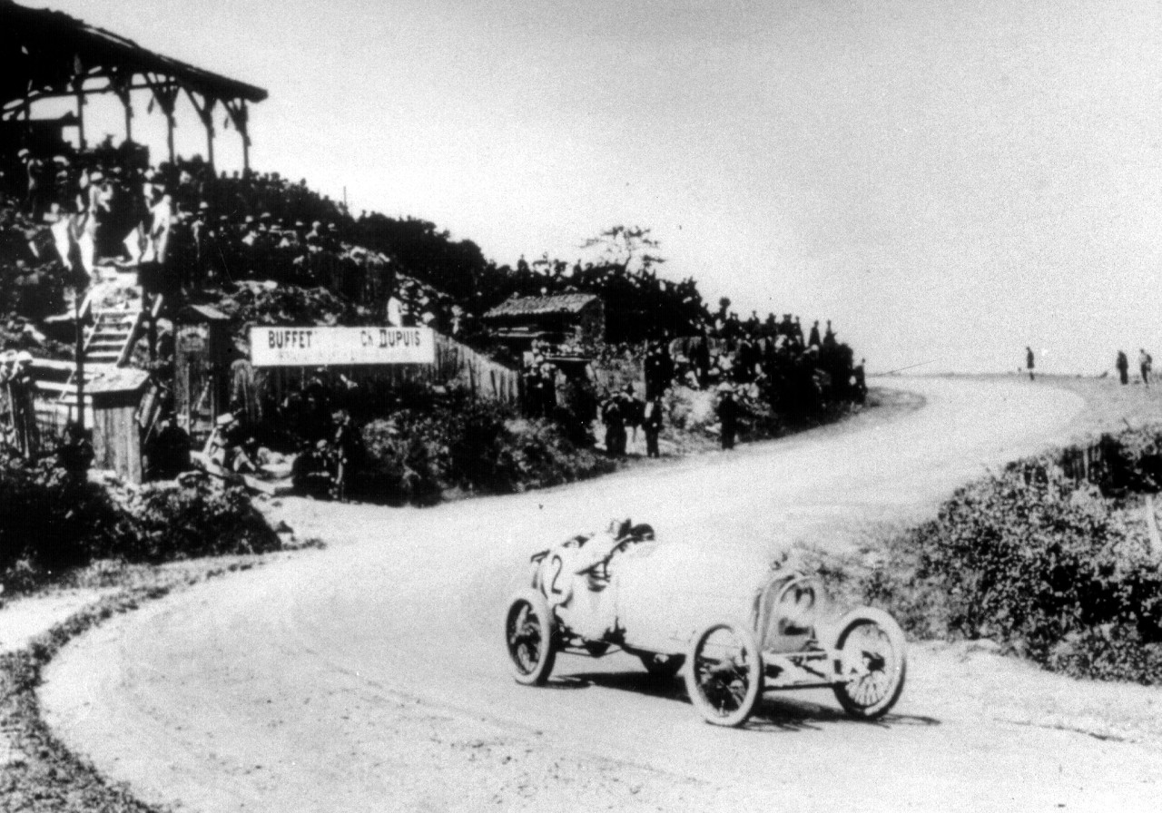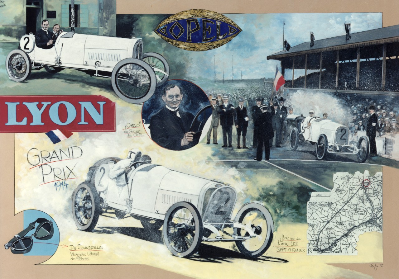 Friedrich „Fritz“ Opel, Sohn von Firmengründer Adam, reist selbst nach Lyon, um seinen Fahrern zur Seite zu stehen. Der Austragungsort des Grand Prix de l’ACF wechselt regelmäßig. Gefahren wird nicht auf permanenten Rennstrecken, sondern auf öffentlichen Straßen, die für die Rennen gesperrt und entsprechend präpariert werden. Der Start- und Ziel-Bereich des 36,7 Kilometer langen Kurses, den es 20 Mal zu umrunden gilt, liegt in Brignais im Südwesten von Lyon. Eine große Anzeigetafel informiert hier die Zuschauer über das Renngeschehen. Auch an anderen Stellen rund um den Kurs gibt es Tribünen, die meisten der rund 300.000 Grand-Prix-Begeisterten verfolgen das Geschehen allerdings entlang der Strecke. Opel geht aus Reihe 1 ins Rennen. Carl Jörns startet neben dem Ungarn Ferenc Szisz, damals ein internationaler Star und 1906 Sieger des ersten Grand Prix überhaupt. Szisz fährt 1914 ein Automobil der französischen Marke Alda. Die Startreihenfolge ist zuvor ausgelost worden, Qualifikationstrainings gibt es noch nicht. Als wäre dieses Sportereignis ein Fanal, entwickelt sich das Rennen zu einem Duell zwischen Automobilherstellern aus jenen Nationen, die wenige Wochen später erbittert Krieg gegeneinander führen werden – Deutschland gegen Frankreich. Marken aus anderen Ländern spielen, obwohl am Start, kaum eine Rolle. Carl Jörns fährt ein solides Rennen und wird nach mehr als acht Stunden Renndauer Zehnter.