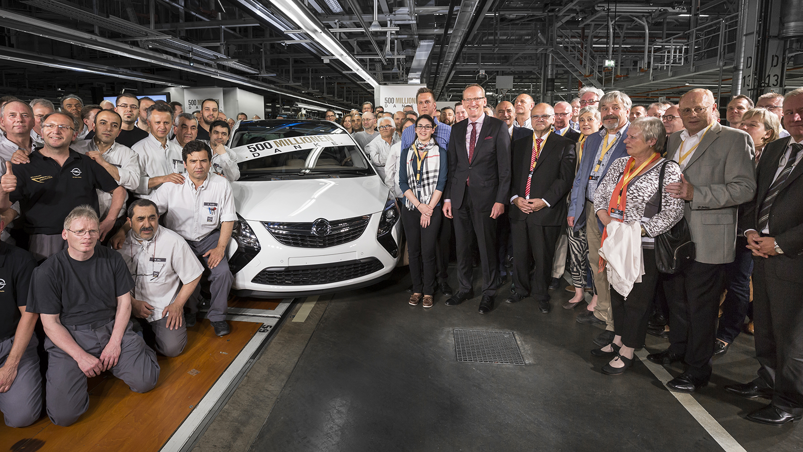 - Denkwürdiger Moment am Band, das kurz stillsteht: Mitarbeiter, treue Kunden und die Vertreter der Opel-Führungsriege kommen zusammen. Der Grund ist eine höchst beeindruckende Zahl: 500.000.000, fünfhundert Millionen. So viele Fahrzeuge, darunter 68 Millionen made by Opel, hat der Mutterkonzern GM bis dato produziert. Eines der Autos ist dieser weiße Zafira Tourer.