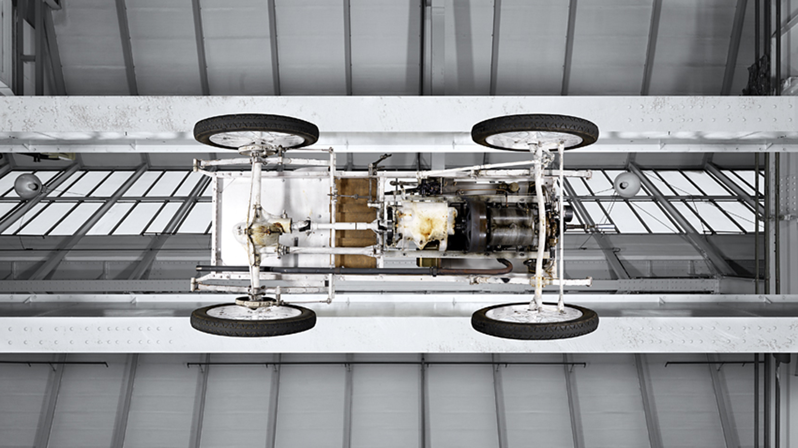 We hung the race cars from their axles and hauled them up eight meters with the crane. Then I positioned myself underneath in the middle, set up the lighting, and shot away.