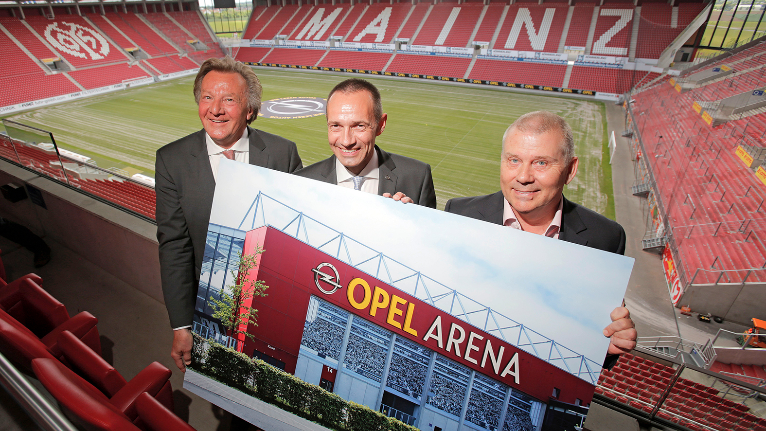 - Blick in die Zukunft: FSV-Präsident Harald Strutz, Opel Deutschland-Chef Jürgen Keller und Mainz 05-Marketingchef Dag Heydecker (von links nach rechts) zeigen wie die Opel Arena ab Sommer aussehen wird.