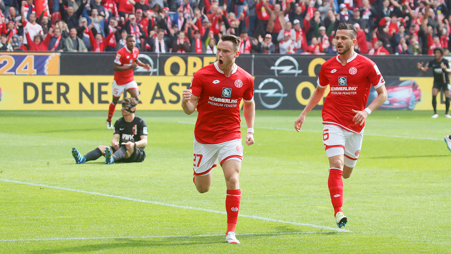 - Verrückt, diese Nullfünfer. Jahr um Jahr verdient der FSV sich den Titel „Die Unerschütterlichen“. Regelmäßig kaufen größere Clubs die Leistungsträger am Bruchweg auf. Doch Mainz 05 erfindet sich immer wieder neu. So auch in der jetzt abgelaufenen Saison: Mit Platz sechs ist Mainz sogar erstmals direkt für den Europapokal qualifiziert. Das Resultat überrascht aber nur auf den ersten Blick. Denn die Truppe bestach durch einen ausgewogenen Kader und trumpfte mit Läufstärke auf, legte im Schnitt pro Spiel mit Abstand die meisten Kilometer aller Bundesligisten zurück. Nicht zuletzt sehen viele den Mainzer Teamgeist als Grund dafür an, dass man nicht nur als einzige Mannschaft beim FC Bayern München gewinnen, sondern auch gegen viele Topvereine aus der Liga, etwa Schalke und Mönchengladbach, immer wieder punkten konnte. Das hier gezeigte Jubelfoto wurde am 28. Spieltag aufgenommen, als Christian Clemens (vorne) einen Doppelpack gegen den FC Augsburg schnürte.