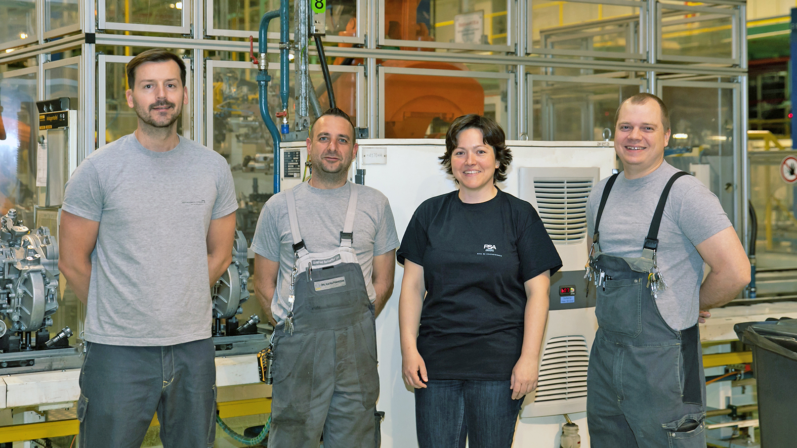 - Katrin Grandl (3.v.l.) war mehrere Monate in Valenciennes tätig, die Instandhalterkollegen Daniel Huber, Gottfried Schöffberger und Michael Schinkowitsch (v.l.n.r.) arbeiteten im Oktober und November 2018 im französischen Schwesterwerk.