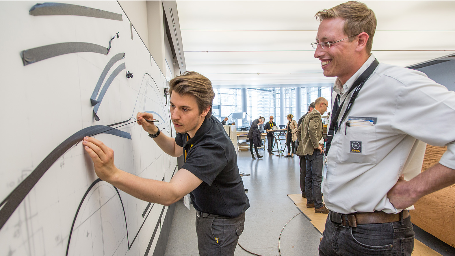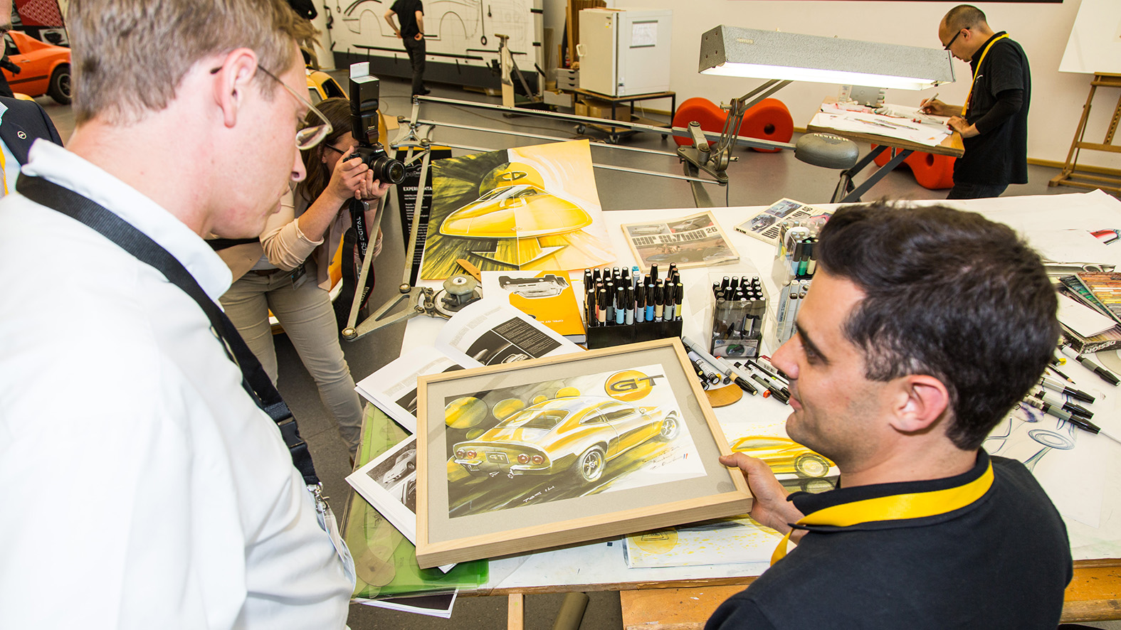 Jetzt startet Wietzoreks Zeitreise aber richtig: In der Mitte des Raums malen die Designer Andrey Gusev und Pierre-Olivier Garcia mit Bleistiften und Pastellkreide Entwürfe des GT und des Luxuscoupés CD (1969). Dabei erklären sie, wie man mit Feuerzeugbenzin Farbkontraste entstehen lässt. Wenige Meter weiter befindet sich die Station „Tape Drawing“. An einer Mattfolie ist dort eine 1:1-Zeichnung des GT befestigt, und Oliver Elst zeigt Wietzorek, mit welchen Handgriffen er die Klebebandstreifen anbringen und so die Linienführung der Karosserie gestalten kann.