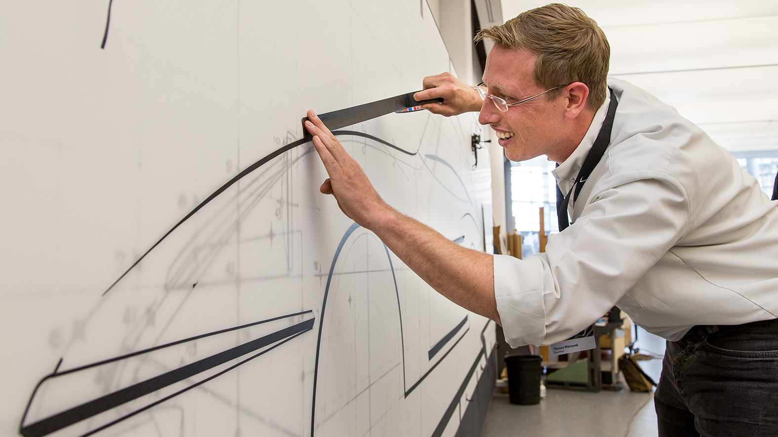 - Oliver Elst demonstriert das Prinzip „Tape Drawing“: An einer Mattfolie ist eine 1:1-Zeichnung des GT befestigt, man kann dort Klebebandstreifen anbringen und so die Linienführung der Karosserie gestalten.