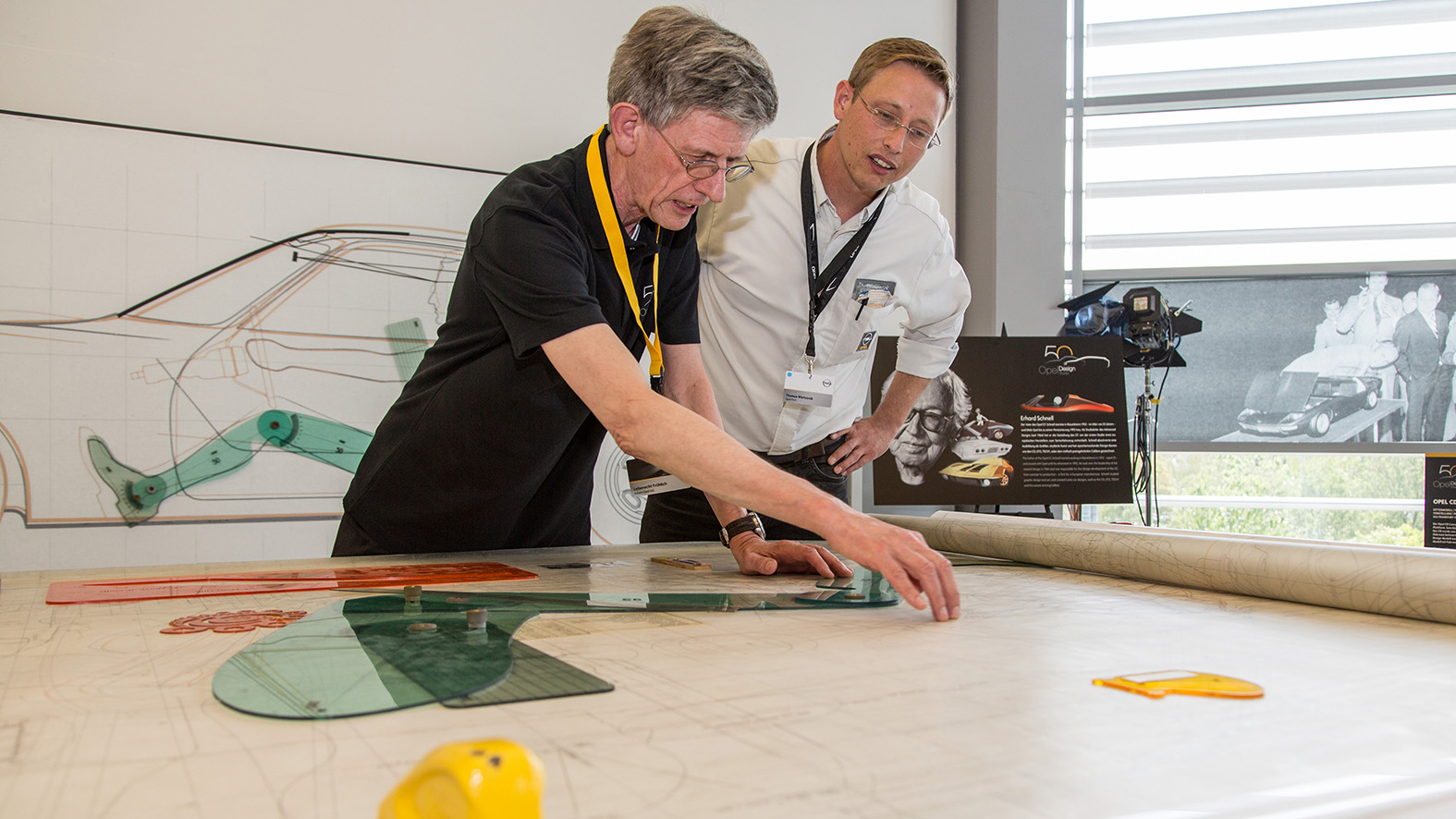 - Leberecht Fröhlich zeigt Wietzorek den Zeichentisch und eine GT-Skizze (Package Plan) in Originalgröße. Von 1964 bis Anfang der 90er-Jahre waren das zwei der Hauptzutaten der Kreativ-Abteilung bei Opel.