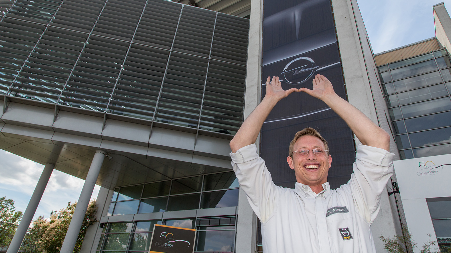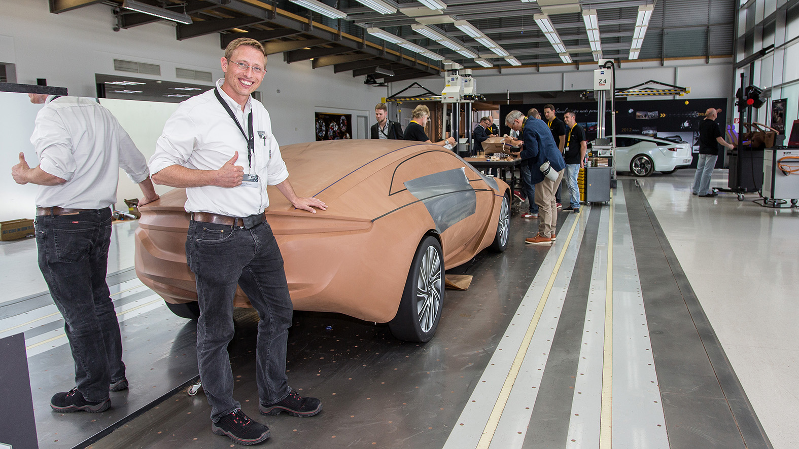 - Sichtbar happy: Die rechte Hand von Thomas Wietzorek zeigt den Daumen, die linke liegt auf einem Clay-Modell des Monza Concept. Der Mitarbeiter aus der Qualitätssicherung erlebt im Design Center, wie Autoentwicklung vorangetrieben wird.