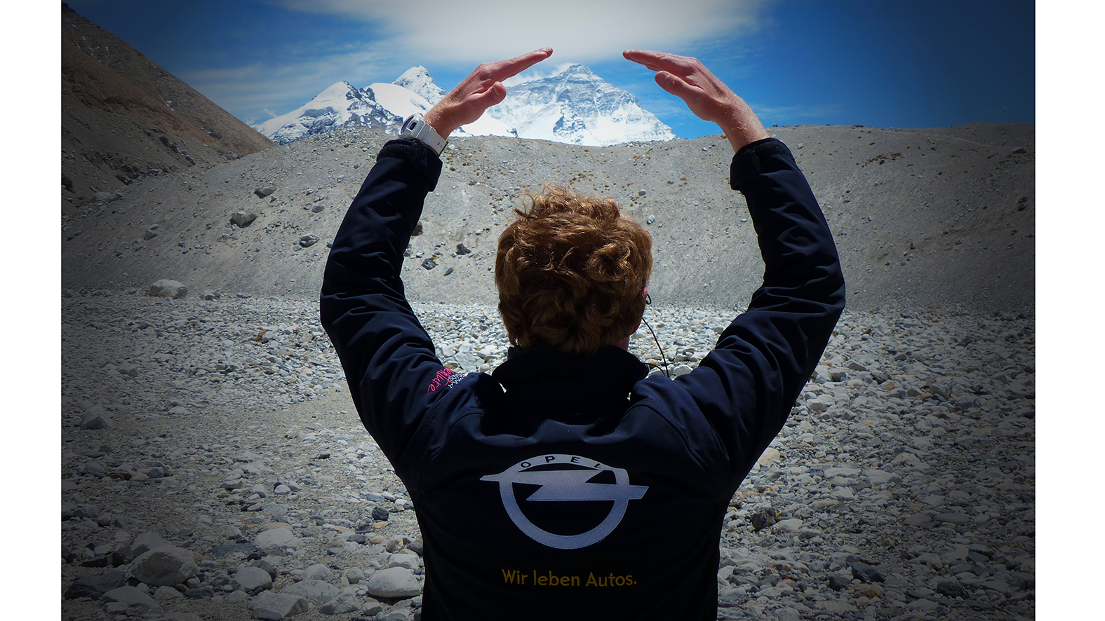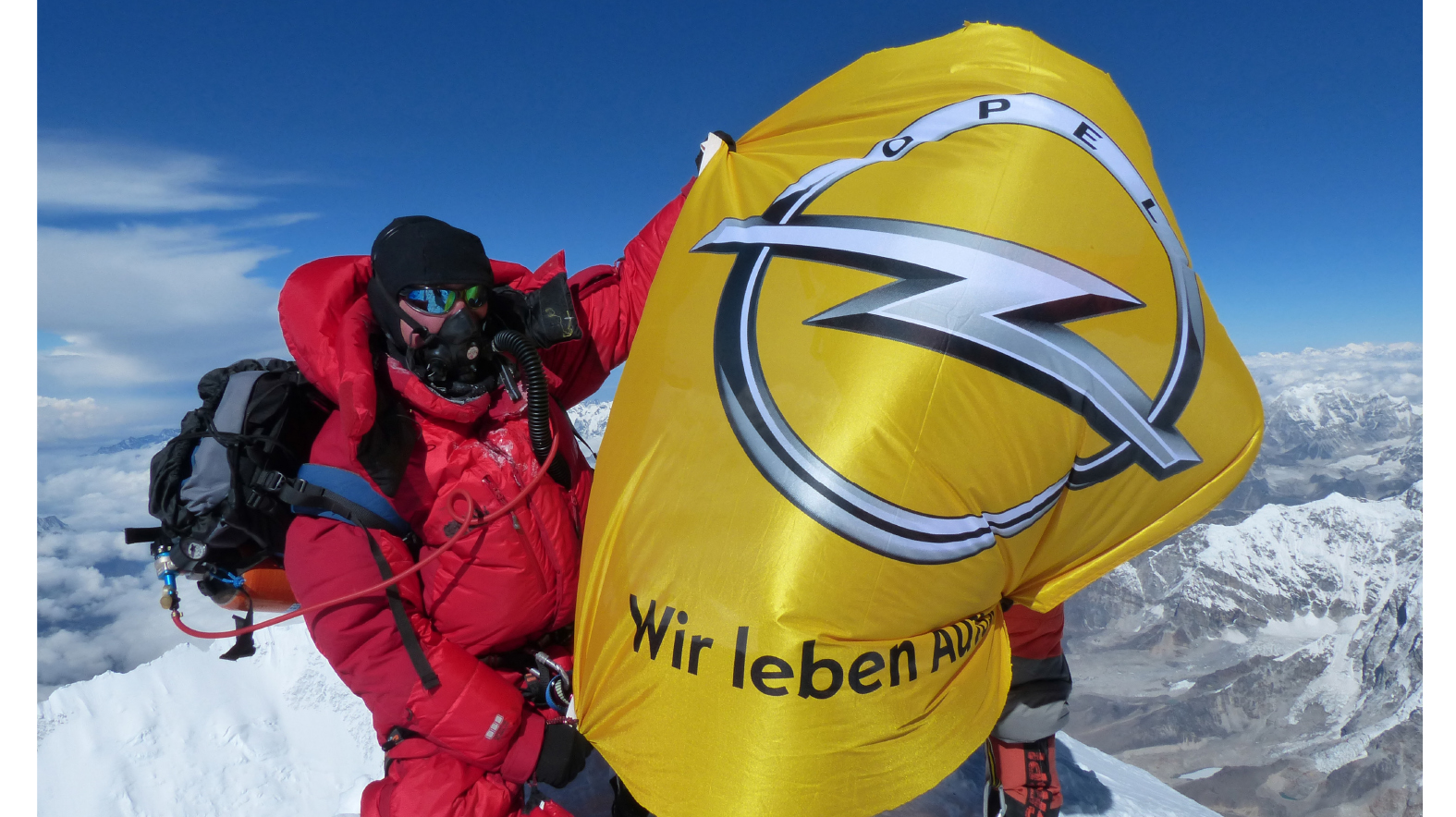 Opel has reached the top of the world. There are clear blue skies, and it is hard to tell the ice and snow from the sea of clouds that drifts between the rocks. Laurent Butaye is standing at the peak of the tallest mountain on earth, standing a mighty 8,848 meters tall. There is a bright yellow flag flapping on his chest, emblazoned with the Opel lightning bolt and the slogan ‘Wir leben Autos.’ The French Training and Quality Manager waited to take the Opel flag out of his backpack until he reached the highest point on earth. “It was important for me to thank my employer for giving me time off to go on this extraordinary adventure,” says Butaye, 37. Not many companies would do that for their employees, of that he is sure.