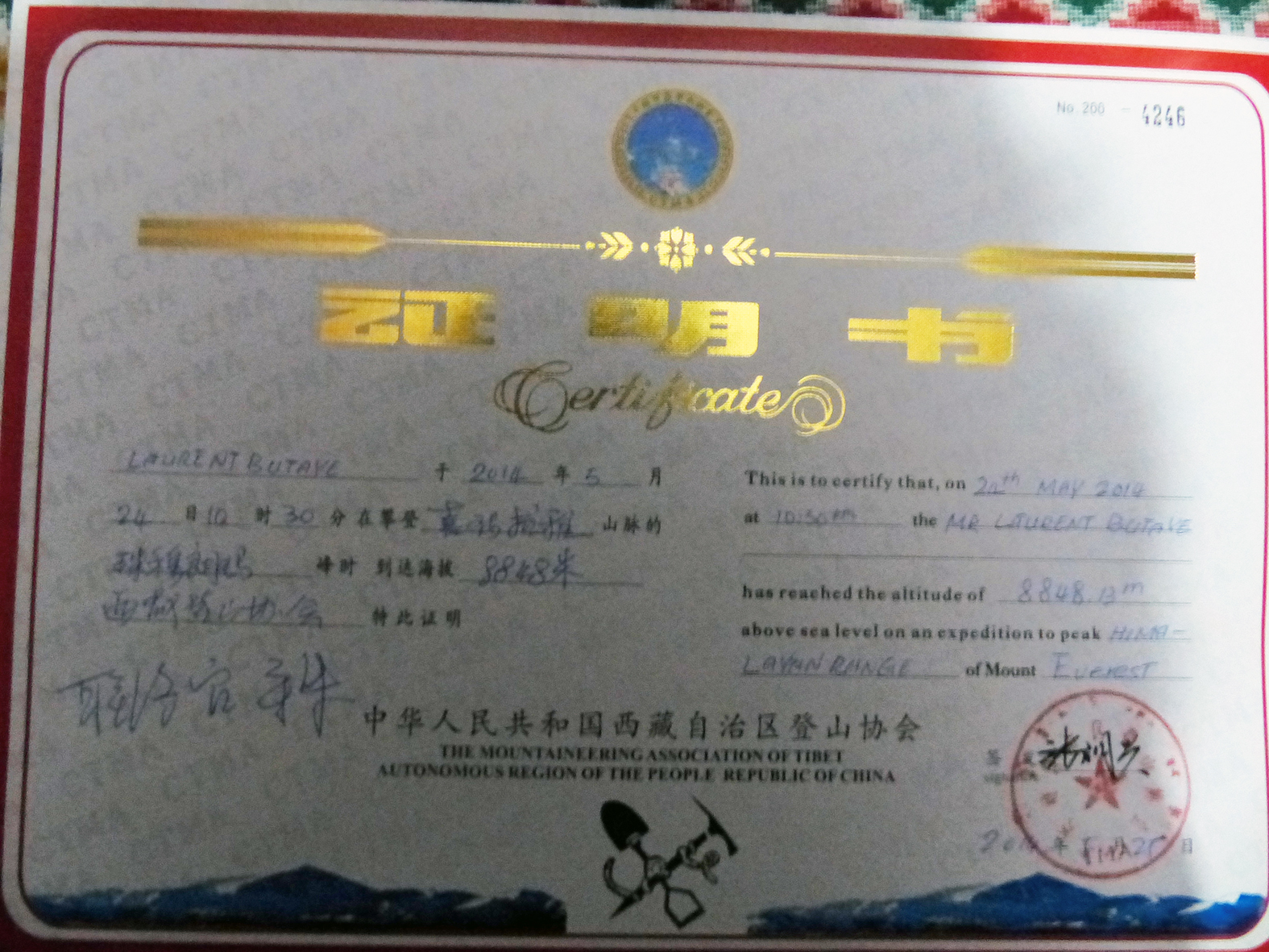 - What remains are the memories, a sense of elation, and also an official certificate from the Chinese government documenting his ascent of Mount Everest.