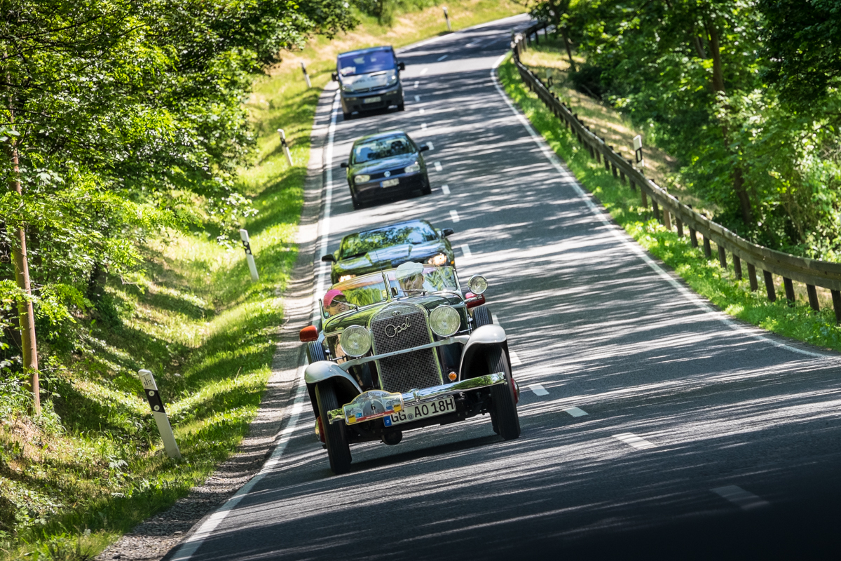 In Eschwege drehen alle Oldtimer auf dem Marktplatz eine Ehrenrunde, bevor es Richtung Mittagspause auf die Creuzburg geht. Über die alte Werrabrücke fahren wir anschließend zum Opel-Werk in Eisenach, wo die nächste GLP wartet. Diese endet wie die anderen zuvor. Zu Kaffee und Kuchen treffen sich alle im Automobilbaumuseum wieder. Am späten Nachmittag geht es wieder Richtung Hohenroda, dem Ziel der ersten Etappe nach exakt 201,1 Kilometern. Okay, bei uns waren es ein paar Kilometer mehr als die geplanten 190, weil wir uns hinter der Werratalbrücke kurzzeitig verfahren haben. Im Streckenbuch steht: „Wenn einige Einmündungen oder Abzweige nicht enthalten sind, lautet die Devise: Immer der Hauptstraße folgen.“ Wir haben da wohl nicht direkt die Hauptstraße erwischt.