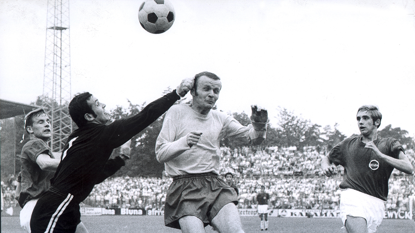 Glanzparade in Glanzzeiten: SC-Torhüter Kirch, der zusammen mit Teamkamerad Günter Lasse (Mitte) vor dem späteren Nationalspieler Erwin Kremers (rechts) klärt. 1969 sorgte der SC Opel mit seinem 3:1-Sieg auf dem Bieberer Berg bei Kickers Offenbach für eine kleine Sensation.