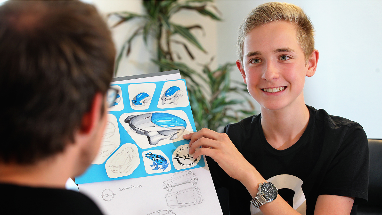 Der Fahrer sucht sein Ziel auf dem Tablet-PC heraus, drückt auf „Start“, und der Wagen setzt sich leise surrend in Bewegung. Der Fahrer es sich mit den anderen Autoinsassen bei einem Kinofilm auf der Couch gemütlich, während das Fahrzeug sie pfeilschnell, aber sicher ans Ziel bringt. Glaubt man dem 14 Jahre alten Valentin Natschke, wird das der Opel der Zukunft sein. Der Schüler aus Fachbach nahe Koblenz ist sowohl leidenschaftlicher Zeichner als auch Fan der Marke mit dem Blitz – und hat seinen Prototypen detailliert zu Papier gebracht: „Frog II“ würde er die selbstfahrende Luxus-Limousine in Blau mit ihren sportlich-eleganten Kurven nennen, die er exklusiv für die Opel Post aus verschiedenen Blickwinkeln gezeichnet hat, ganz im Stil eines Profidesigners.