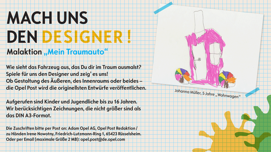 Die Lust auf Autos weckte vor einigen Jahren ein legendäres Modell: „Ein Automechaniker bei mir im Ort fährt einen gelben Manta mit schwarzer Motorhaube. Den finde ich ziemlich lässig.“ Als dann kürzlich Valentins Nachbarn auch noch einen ADAM als Leihwagen bekamen, holte sich der Schüler noch einige ganz aktuelle Inspirationen für seine Designstudien – und lobt die Möglichkeit, sich seinen ganz persönlichen ADAM zusammenzustellen. „Heute wollen die Leute auch mit dem Auto zeigen, wer sie sind.“ Sein Nonplusultra beim Fahrzeugkauf: „Richtig cool wäre es, wenn man eigene Designs einschicken könnte.“ Selbst wenn es nicht so kommen sollte, will Valentin Natschke künftig mitgestalten. Einen Studiengang für Autodesign hat er sich bereits ausgesucht.