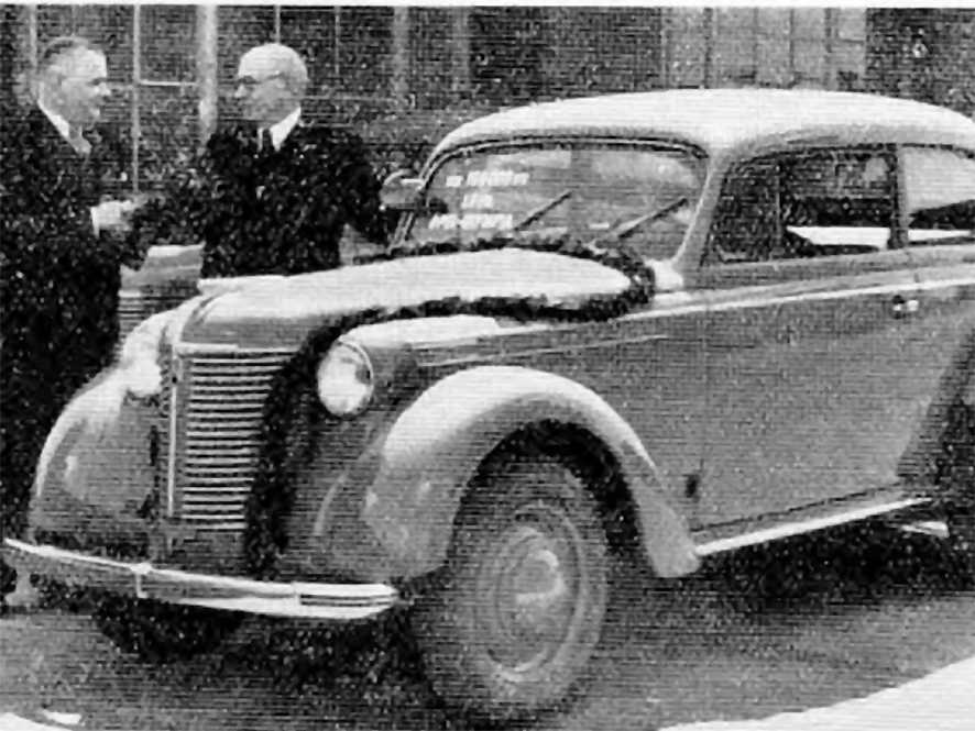 Im Juni 1949 lief das 100.000. Exemplar des 1,5 Liter Modells des Olympia über die Linie, wie die Opel Post meldet. Nach Laubfrosch und dem 1,2-Liter-Opel war der Olympia somit das dritte Opel-Modell, das die 100.000er Stückzahl-Grenze überschritt. Das Foto zeigt den Produktionsleiter Herrn Eberlein, der den Jubiläums-Olympia an Herrn Gaedertz, Inland-Verkaufsleiter, übergibt.