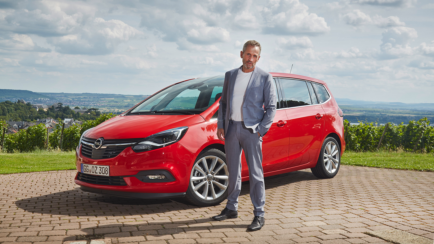 Opel Post is grateful for Wilde’s flexibility in the choice of interview locations. With all due respect to the beauty of the castle and the Rheingau panorama, there is only one place for a conversation about a vehicle advertised as the Opel Travel Lounge: inside the new Zafira itself. Wilde nods, grins, and settles into the AGR-certified (Aktion Gesunder Rücken) ergonomic seat of a ‘lava red’ Zafira. “Wow,” he says just a few meters into the spontaneous test drive. “I like it. It’s the 200 horsepower version.” The first thing Wilde, 50, pays attention to in a car is the engine. “I’m not a hot-rodder, but I still like to have plenty of horsepower under the hood, just so I know I could if I wanted to.”