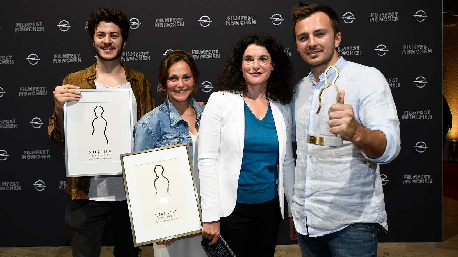 - Talentierter Nachwuchs: Die drei Erstplatzierten Rupert Höller („Nr. 98“), Chiara Grabmayr („Moonjourney“) und David Helmut („Integration“) mit Opel-Marketingchefin Tina Müller.