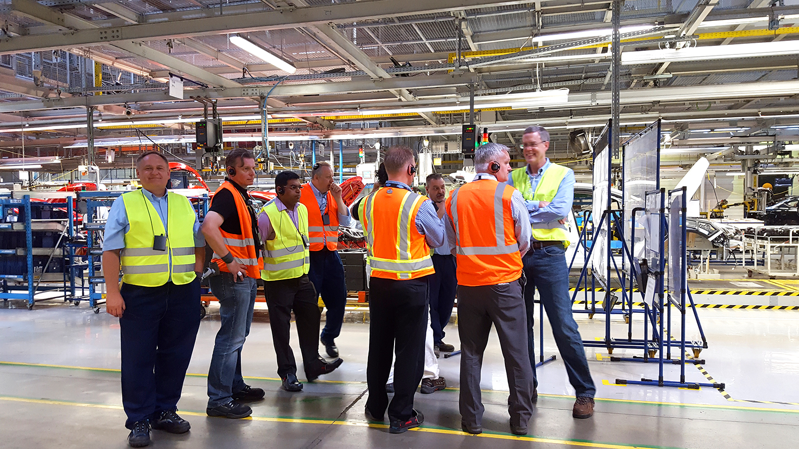 - Goście na wydziale montażu głównego podczas prezentacji wózka samojezdnego dowożącego materiał do linii montażu kokpitu.