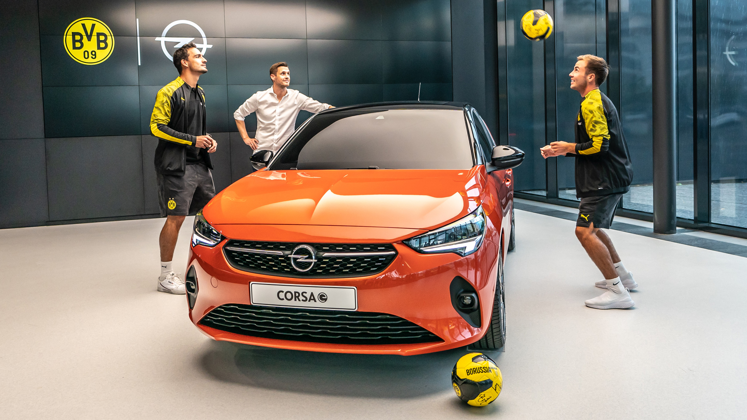 - Home game in Rüsselsheim: Mats Hummels (left) and Mario Götze juggling a ball over a Corsa-e at the Design Center. Sebastian Kehl, head of the licensed players department, observes the training session.