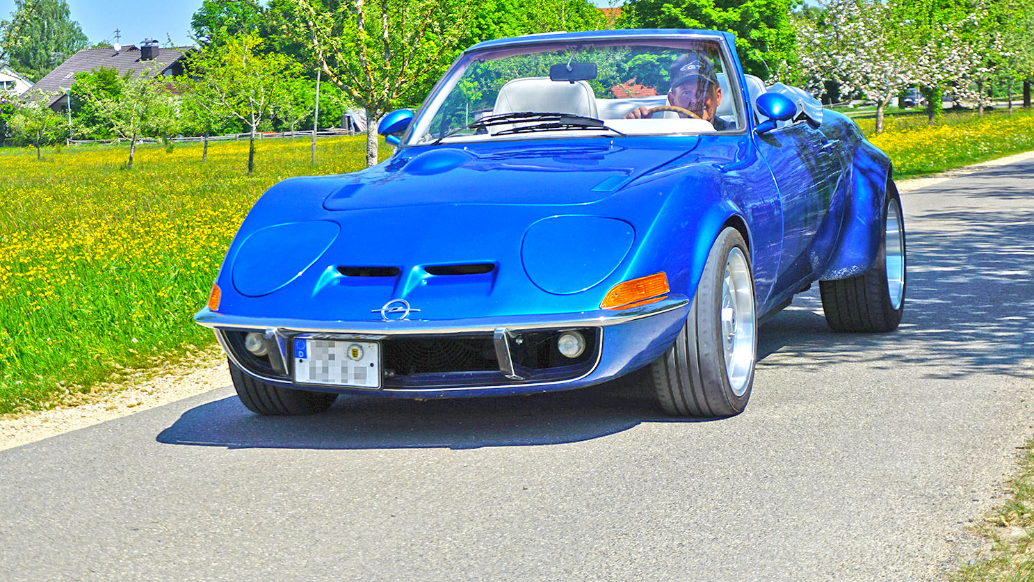 Wie das in den Siebzigern aussah, zeigt eindrucksvoll ein Blick auf Helmuts zweiten GT – oder wie er selbst stolz sagt: „Mein blaues Schätzchen.“ Das GT-Cabrio fährt in einem zeitgenössischen Umbau vor, umgesetzt von Spezialisten aus München. Die technische Optimierung übernahm die Strauss-Kraftfahrzeugtechnik aus Böhmenkirch: Ein 3,0-Liter-E-Motor aus dem Monza, breitere Manta-B-Hinterachse inklusive Differenzialsperre, Sportfahrwerk, Auspuffanlage und eine veränderte Kühlerarchitektur für die optimale Belüftung des Reihensechsers hielten Einzug in den GT. Doch der Reihe nach.