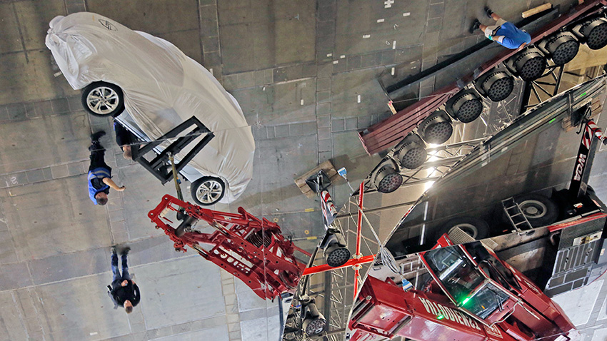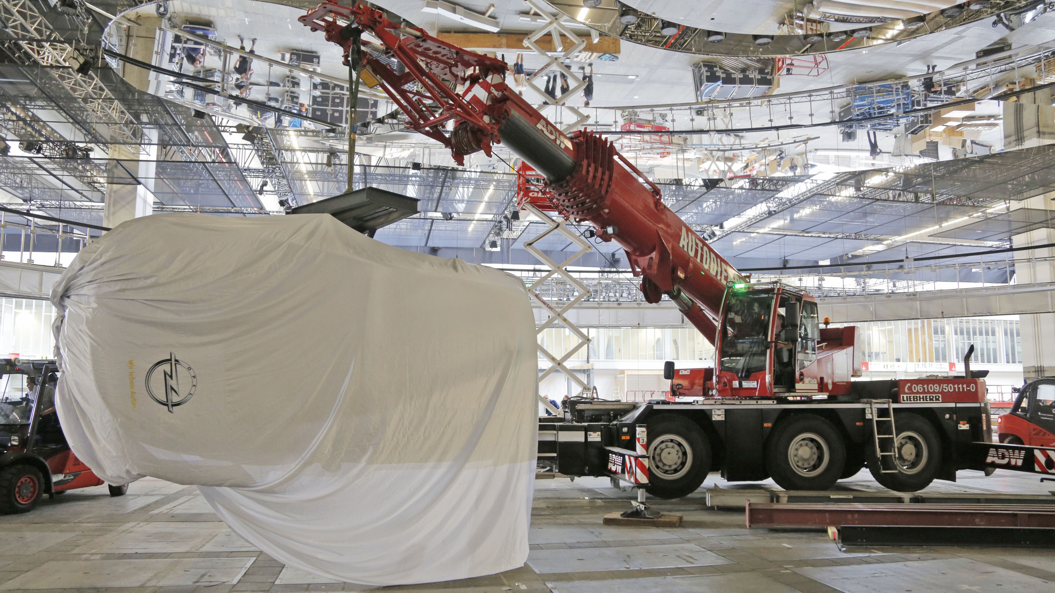 Durch das riesige Rolltor fährt ein Autokran herein, am Auslader hängt verhüllt der Premieren-Star, der neue Astra, der in drei Metern Höhe senkrecht an ein Gerüst verschraubt wird. Nebenan lächelt die Messe-Hostess noch immer vom Foto. Zusammen zeigen beide – Astra und Hostess –, wohin die Reise geht: Noch acht Tage und 18 Stunden, dann kann die große Show beginnen.