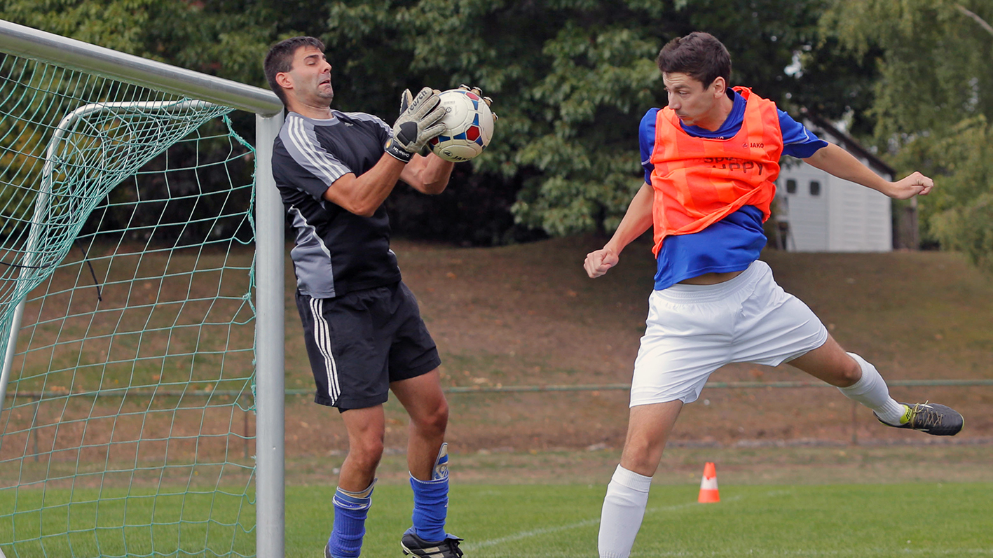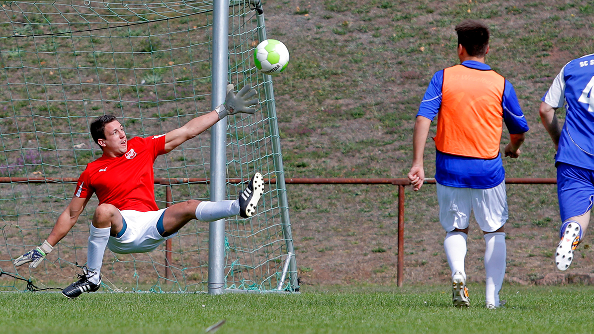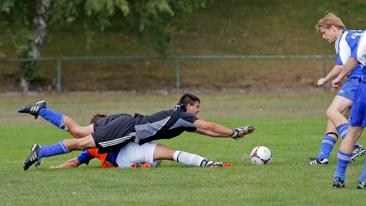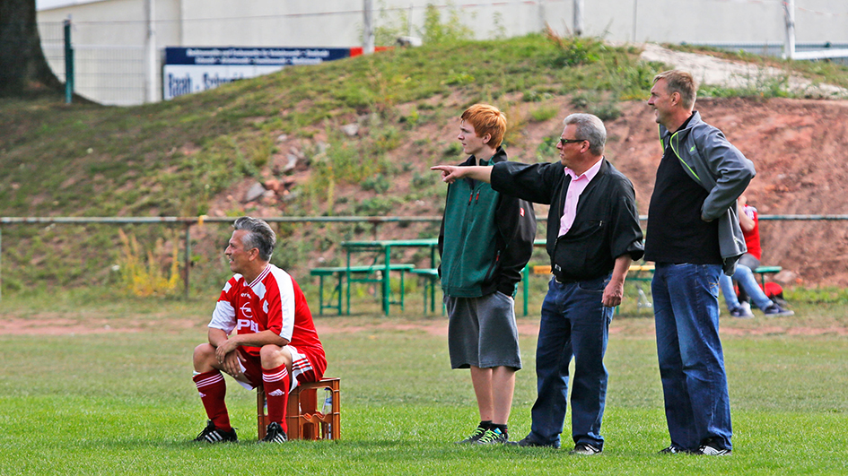 So kann’s gehen. Eigentlich hatte Dirk Westrich die „Blechformers“ nur coachen wollen, doch nachdem sich ihr Stammtorhüter kurz vor dem Turnier verletzte, musste er von jetzt auf gleich als Keeper ran – „und das, obwohl ich von Haus defensiver Mittelfeldspieler bin.“ Dass er sich in einem sehr professionell anmutenden Outfit präsentieren durfte („Das hat mir ein Kollege besorgt“), vermochte sein bescheidenes Selbstvertrauen nicht zu stärken: „Ich bin kein guter Tormann“. Mitspieler und Publikum sahen das anders. Dirk Westrich stand beim einzigen 0:0 des Turniers – gegen „Hangover 69“ – zwischen den Pfosten. Auf dem Kleinfeld geht’s eigentlich nur torlos aus, wenn gute Keeper zwischen den Pfosten stehen, doch auch das vermochte Dirk Westrich nicht zu überzeugen: „Meine Vorderleute waren halt stark.“ Mehr Understatement geht wirklich nicht.
